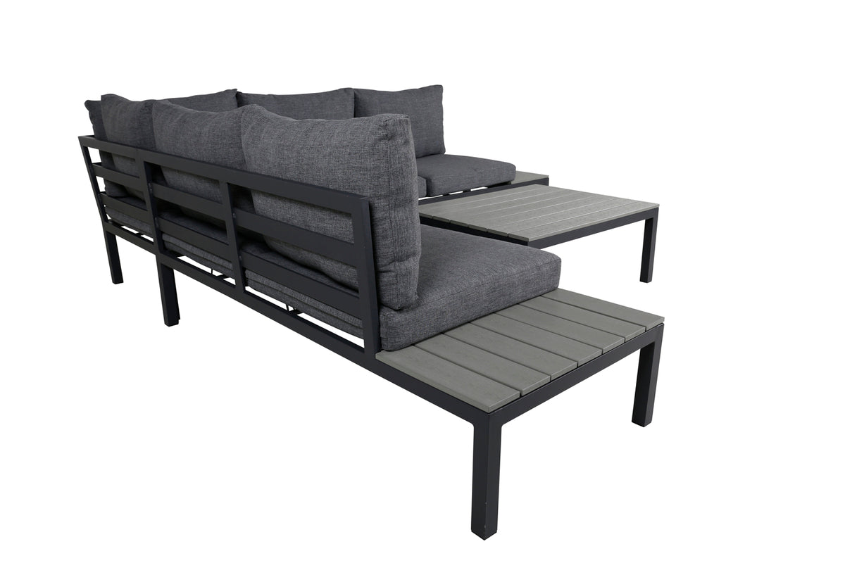 Stilren, smart og slidstærk – en perfekt sofagruppe til terrassen til sommer! Odense er en klassisk og enkel hjørnegruppe i lækkert lounge-design med en sort ramme i aluminium og grå topplade i polywood. På hver side af sofaen er der små "sideborde", perfekt til ekstra aflastningsplads. Sofagruppen er velegnet til udendørs brug og passer lige så godt ude i haven som i hjørnet på terrassen. Grå hynder medfølger, hvilket gør gruppen lige så flot som behagelig!