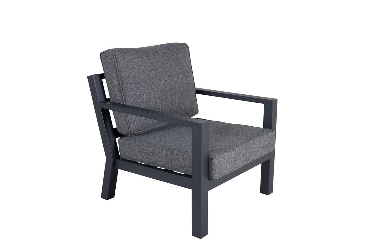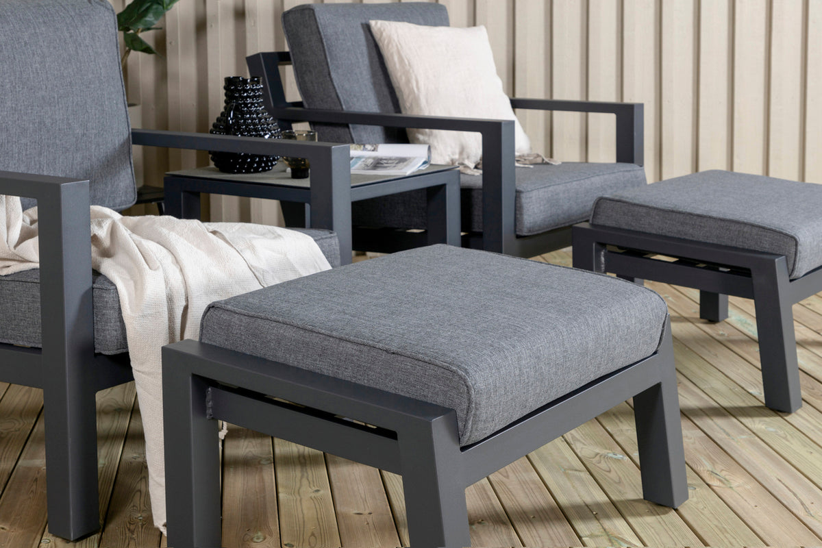 Skab et blikfang, der imponerer, med et komfortabelt loungesæt fra serien Barcelona. Bestående af to loungestole i robust design fremstillet af sort aluminium og et tilhørende bord med en topplade i stilrent glas. Slidstærke hynder i sort farve medfølger. Bordets mål: 50x50x50 cm. Stolens mål: 159x84x77 cm. Siddemål: 63x55x31 cm. Ingen montering kræves. Her kan du slappe af og nyde sommerens udeliv på terrassen!