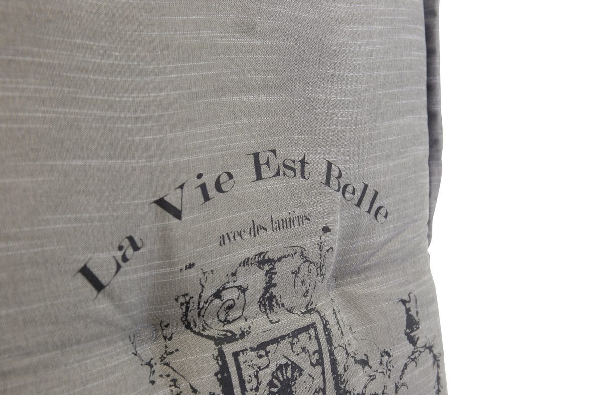 Denne hynde har et gråt polyesterstof med et sort tryk på. Hynden passer perfekt til vores positionsstole og har remme på bagsiden, der sikrer, at hynden bliver på plads. Med denne hynde kan du nyde komforten hele sommeren!