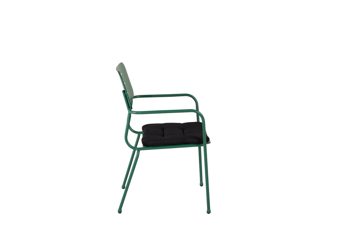 Nicke er en nydelig og farvestrålende stol i en strålende grøn farve, som passer til alle slags spiseborde. En stol i slidstærkt stål, der lyser op på terrassen såvel som i haven. Skab en dejlig følelse på terrassen med et smukt farvepift og stilrent design. Hynder kan tilkøbes. Stolen er stabelbar.