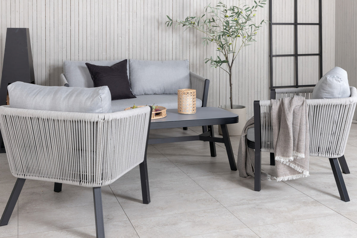 Virya er en moderne loungesæt med fokus på komfort - den passer perfekt på terrassen eller altanen. Møbelgruppen består af en to-personers sofa, to lænestole fremstillet i sort pulverlakeret metal med en ryg, der er designet i lysegråt reb. Inkluderet i gruppen er lysegrå bløde hynder samt et rektangulært lavt sofabord med en bordplade i grå finish, der matcher rebenes og hyndernes nuance og skaber en eksklusiv helhed. Nyd behagelige sommeraftener i et hyggeligt sofasæt!