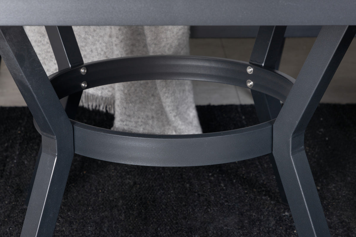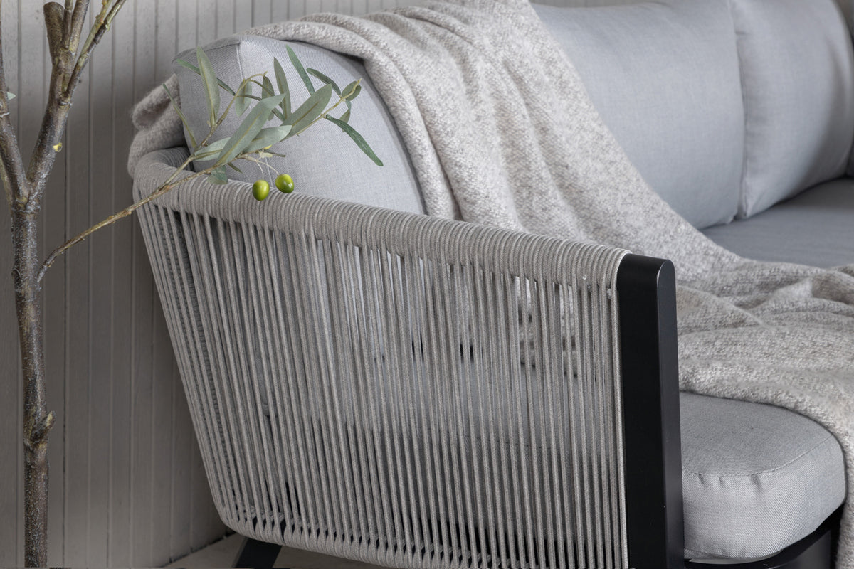 Virya er en moderne sofagruppe med fokus på komfort og design, der garanteret vil blive et hit på terrassen til sommer! Møbelgruppen består af en hjørnesofa fremstillet i et slidstærkt design i sort pulverlakeret metal med en ryg, der er designet i lysegråt reb, samt et rektangulært højt sofabord med en bordplade i grå finish, der matcher rebenes og hyndernes nuance og skaber en eksklusiv helhed. Bløde, lysegrå hynder medfølger til sofagruppen!