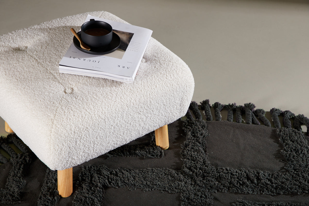 En trendy indretningsdrøm, der løfter den varme og indbydende følelse til rummet! Denne puf fra serien Salina imponerer med sit luksuriøse look og bliver en flot indretningsdetalje. Fremstillet i benhvid farve af blødt teddy stof, træ og metal med dybhæftede knapper i stoffet, som bliver en lækker detalje. Puffen har et lavt design med træfarvede ben, der bidrager til en luftigere atmosfære og muliggør nem støvsugning. Hæv stilniveauet i dit hjem!