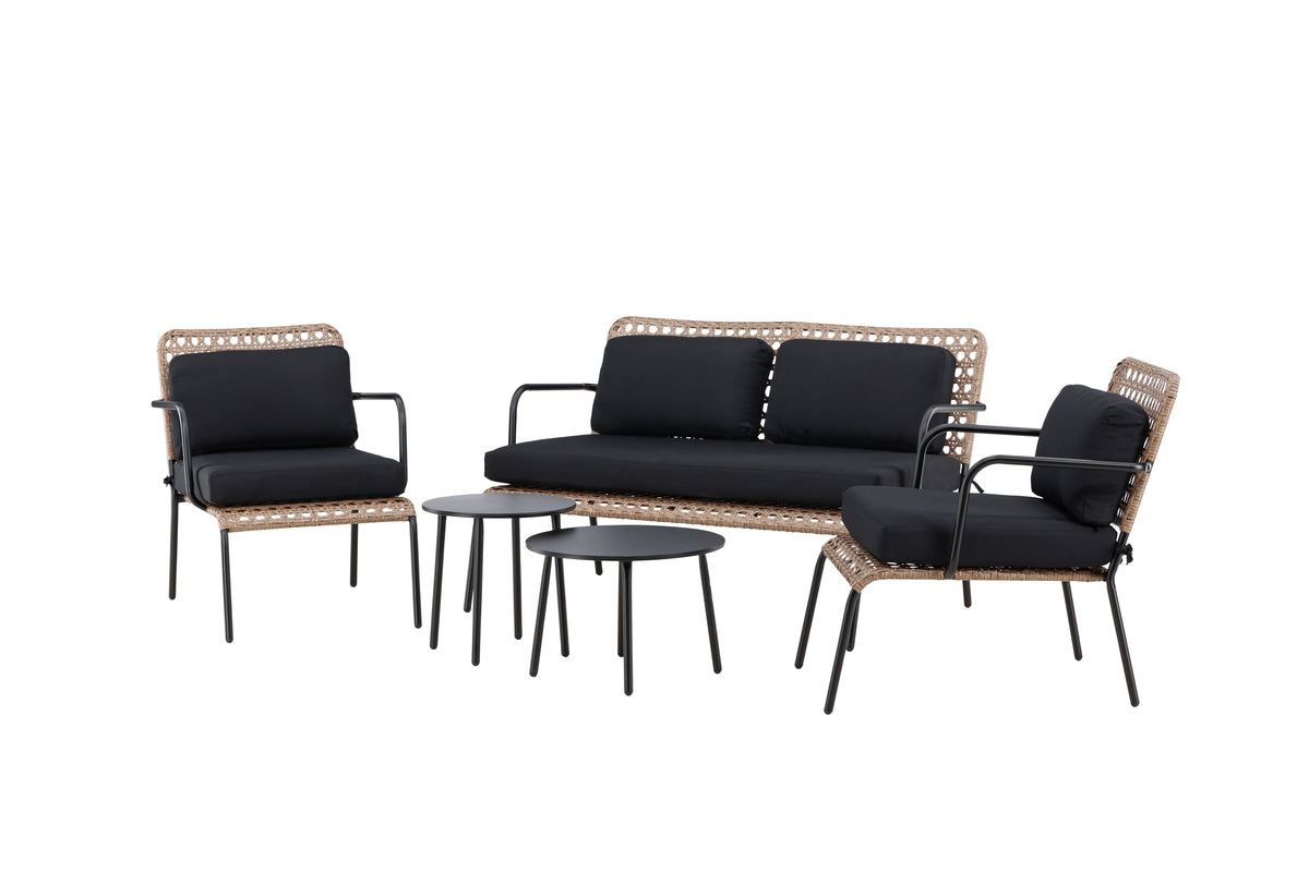 En moderne sofagruppe med fokus på komfort, der passer perfekt på den glasinddækkede terrasse. Møbelgruppen består af en to-personers sofa, to lænestole med armlæn, fremstillet i sort pulverlakeret metal, og ryg og sæde er designet i et flot mønster af natur rotting. Møbelgruppen leveres med sorte hynder samt runde sorte sideborde i et sæt med to dele. Det naturlige materiale giver hvert enkelt møbel en unik karakter, og dets mønster vil tiltrække opmærksomhed. Lettere montering kræves.