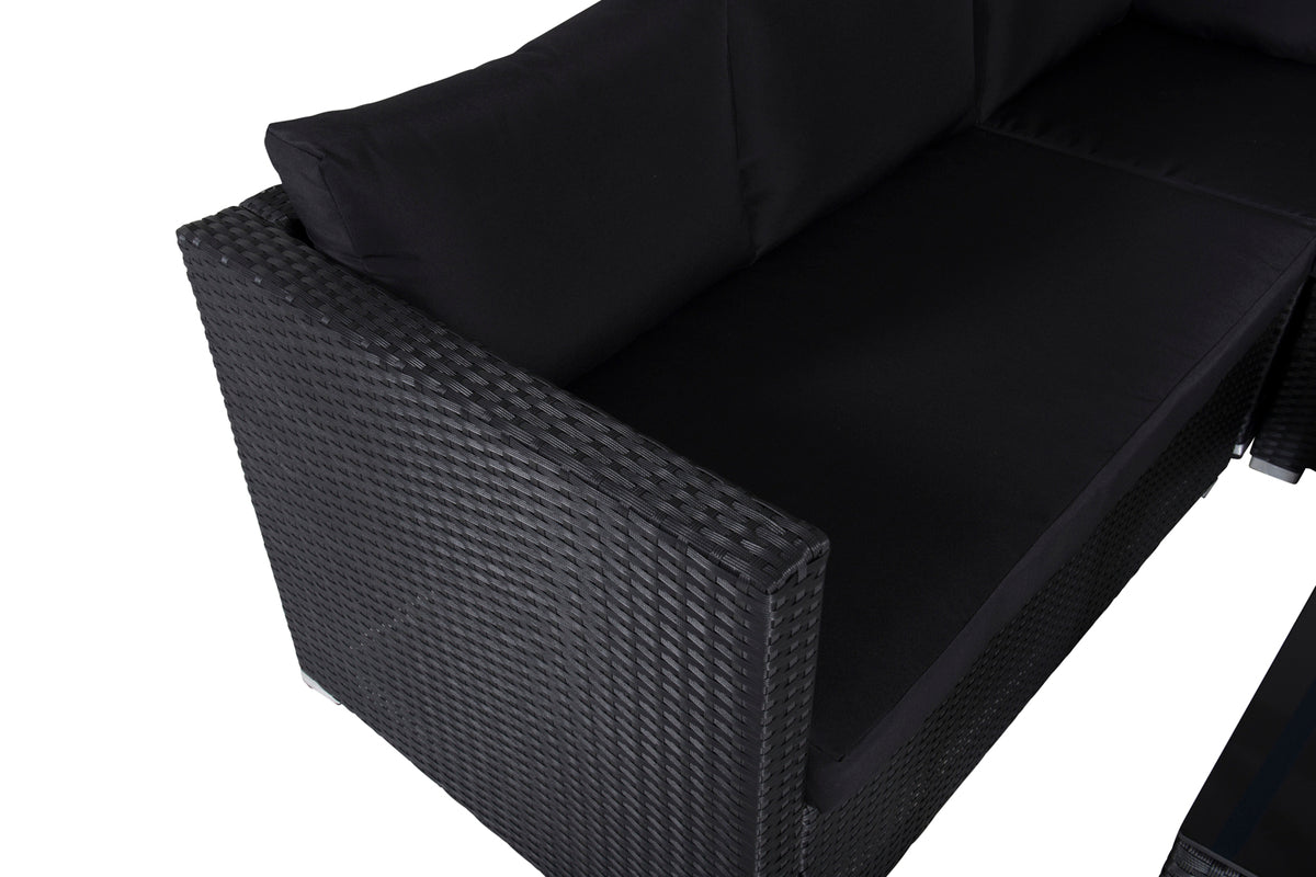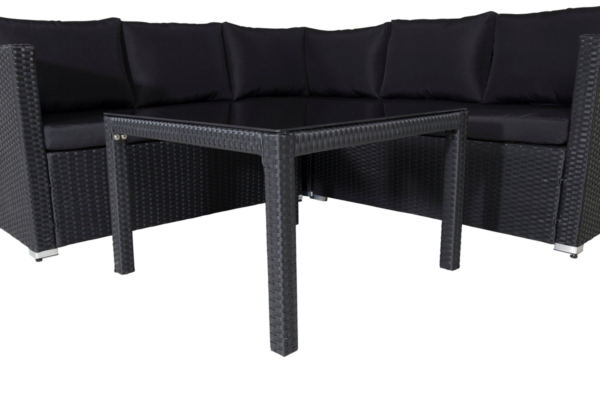 Kuba er en moderne loungesæt i sort kunstflet af høj kvalitet, der er perfekt til terrassen eller altanen. Loungesættet består af en hjørnesofa, der er modulbaseret, så den kan placeres på flere forskellige måder, med 4 siddepladser og et hjørne. Inklusive sorte, bløde hynder samt et rektangulært sofabord med en bordplade af sort glas. Det matchende helhedsdesign skaber et imponerende og indbydende blikfang! Mål: 180x180 cm. Lettere montering kræves.
