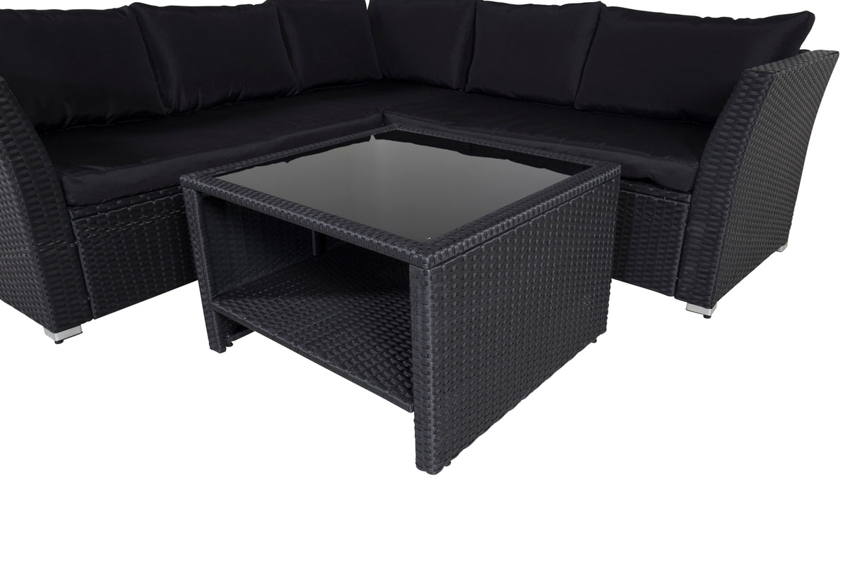 Moderne loungesæt i sort polyrattan af høj kvalitet til terrassen eller altanen. Loungesættet består af en hjørnesofa, der er modulbaseret, så den kan placeres på flere forskellige måder, med 4 siddepladser og et hjørne. Inklusive sorte, bløde hynder samt et rektangulært sofabord med en hylde og en bordplade af sort glas. Mål: 194x194 cm. Lettere montering kræves.