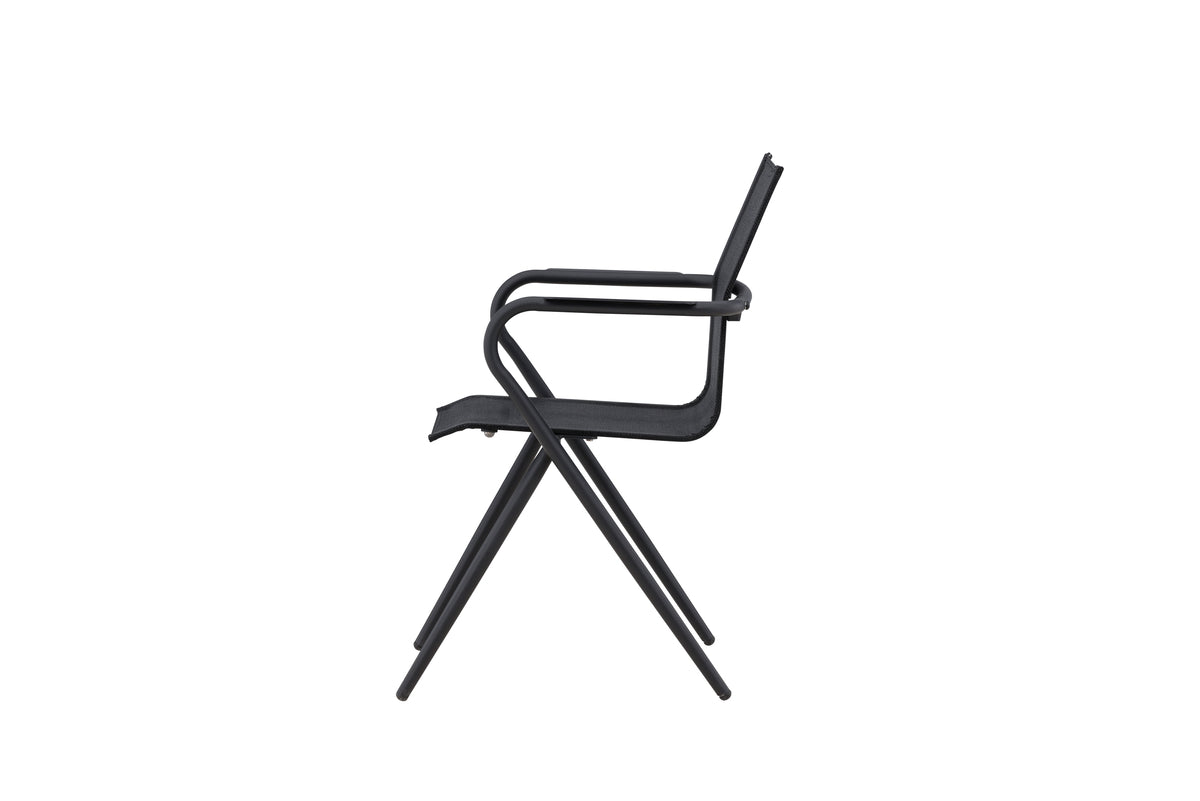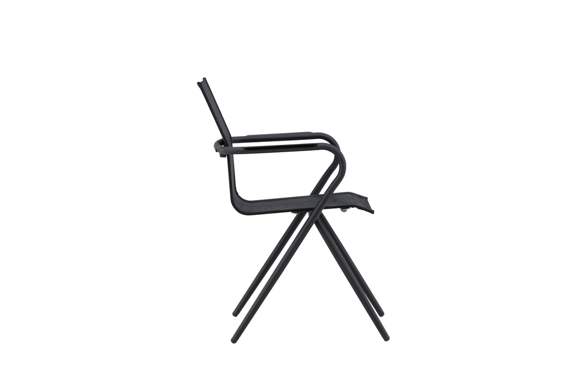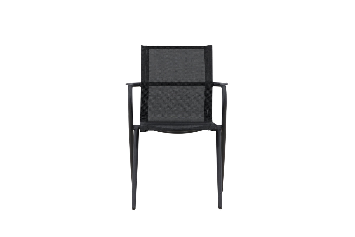 Alina – lige så praktisk som iøjnefaldende! En sort, smagfuld spisebordsstol, der passer perfekt til udestuen såvel som terrassen. Gennem sin enkelhed og slidstærke materiale gør den sig godt i alle miljøer og stilarter. Designet er moderigtigt med moderne udsvungne ben og armlæn for komfort. Nyd sommerens måltider! Stolen er stabelbar.