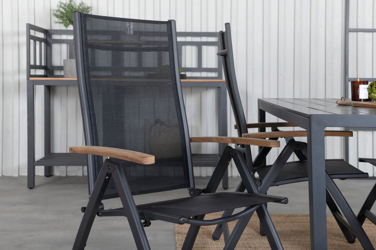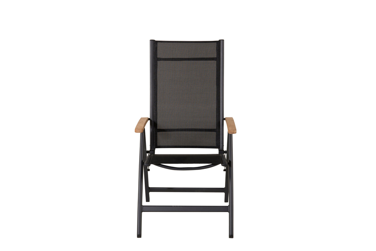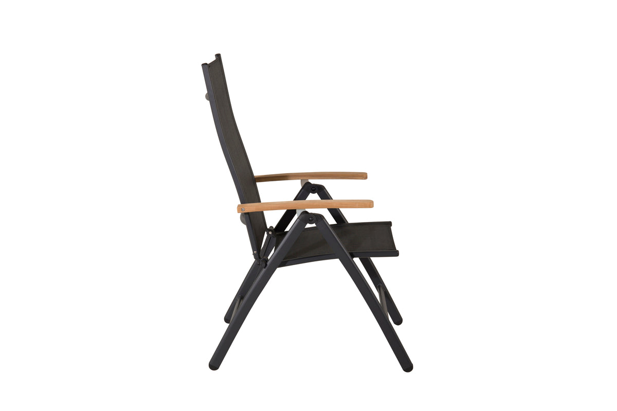 Panama, en sort sammenklappelig spisebordsstol til udendørs brug. Med smagfulde armlæn i teak får stolen et pompøst udtryk, der passer til mange smag. Stolen fungerer lige godt til moderne som klassiske spiseborde. Juster ryglænet for optimal komfort og nyd mange vidunderlige sommerdage sammen!