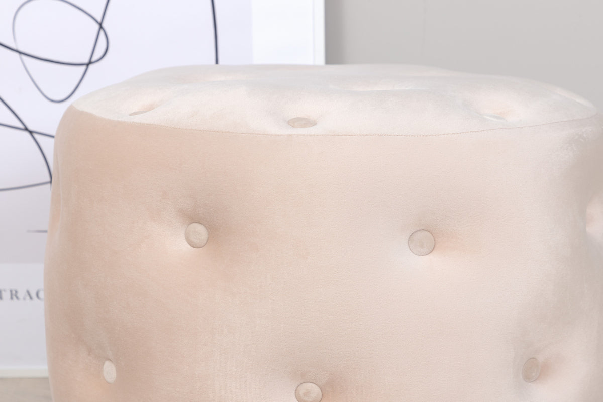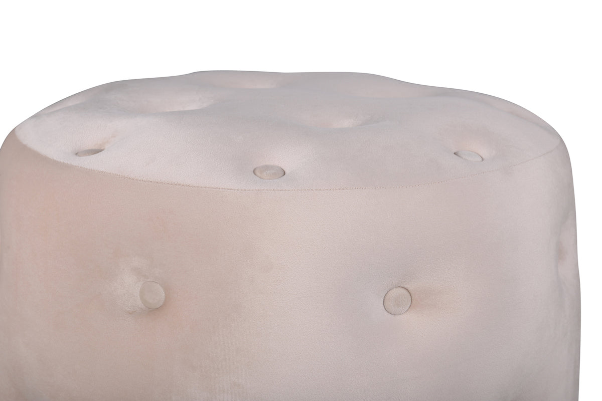 Skab et modebevidst blikfang, der imponerer! Skammelen Benjamin har et luksuriøst design med dybe hæftninger og beklædte knapper i en fløjlsblød beklædning. De bløde former og den beige farve giver en indbydende følelse og stilsikker glans til rummet. Den bløde skumstopning gør pallen behagelig at sidde på - brug den som ekstra siddeplads, når gæsterne bliver mange, hvil fødderne efter en lang dag eller placer den solitært som et stilikon. Denne skammel løfter garanteret indretningen til næste niveau. Fremstillet af skum, bomuldsfibre, fløjl og bøjet træ. Skammelens mål: Højde: 44 cm, diameter: 55 cm.