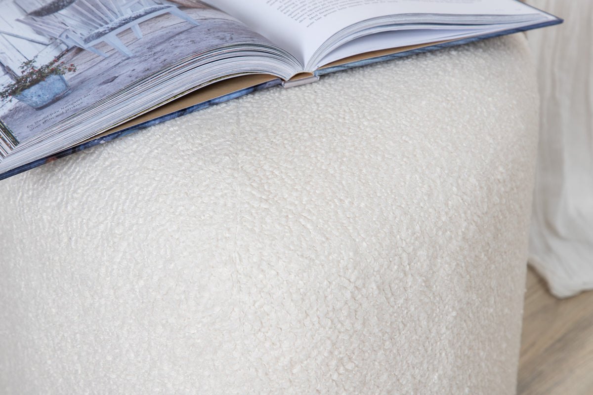 Peg - en trekantet indretningsdrøm og smart tilføjelse til hjemmet! Med sin nette størrelse og luvende teddy-stof i en hyggelig hvid farve passer den lige så godt som fodskammel eller ekstra siddeplads som et selvstændigt stilikon. Siddepuffen Peg udmærker sig ved sine bløde former og modebevidste design, der fanger blikket. Fremstillet af materialerne skum, bomuldsfibre, teddy-stof og bøjet træ. Puffens mål: Højde: 41 cm, diameter: 46 cm. Indret rummet smart og stilsikkert!