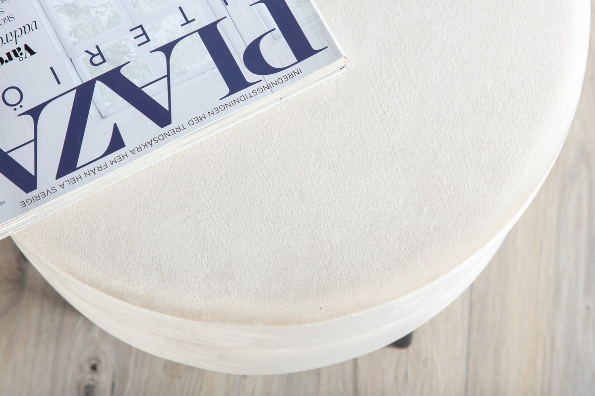 Sækkestolen Pot skaber hurtigt en indbydende atmosfære i hjemmet! I sin lækre benhvide farve og fløjlsbløde stof giver den et varmt og stilrent indtryk til det rum, den placeres i. Sækkestolen har et nætt, rundt design fremstillet af skum, bomuldsfibre, stof og bøjet træ. De let udadgående ben er i sort stål og får møblet til at føles lidt mere let og luftigt. Puffens mål: Højde: 40 cm, diameter: 40 cm. Brug den som en ekstra siddeplads, fodskammel eller aflastningsflade - den bliver en lækker indretningsdetalje i flere rum!