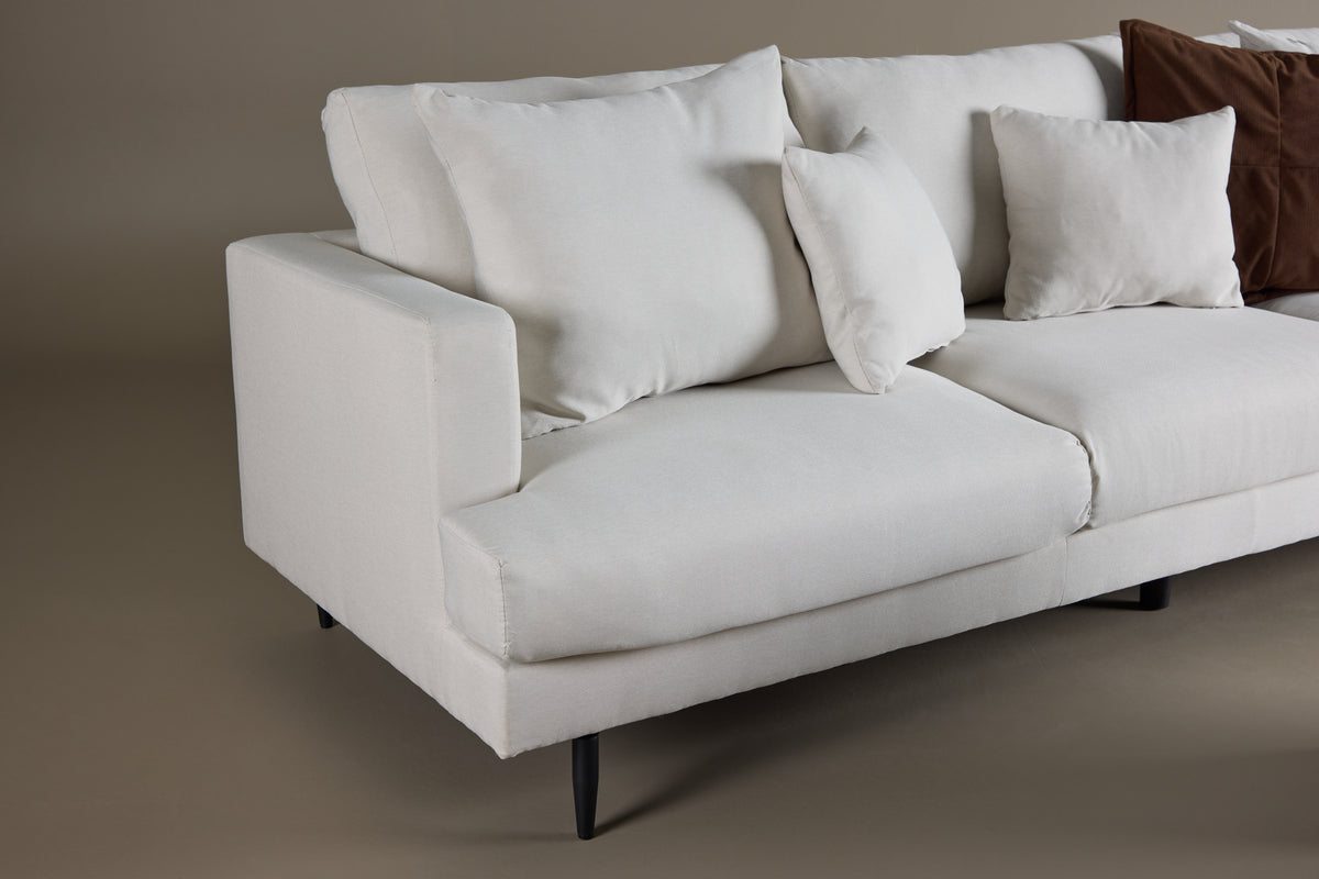En sofa-drøm for alle moderne linnedelskere lige nu! Denne beige sofa fra serien Sofia er en rummelig 3-personers sofa med stilrent betræk i beige linned med fokus på høj komfort. Følg vores tips for bedste pleje, så får du desuden en sofa, der holder over tid. Designet er både iøjnefaldende og afslappende med sit bløde og indbydende ydre, som passer perfekt til at synke ned i efter en lang dag. Sofaen er bygget op af puder, der udgør ryglænet og pryder også armlænene. Den bæres oppe af fire ben i sort metal, som giver et fedt løft og gør det nemmere for støvsugeren. Lige så pæn som praktisk, helt enkelt. Hyg jer sammen med familien eller bred dig ud alene!