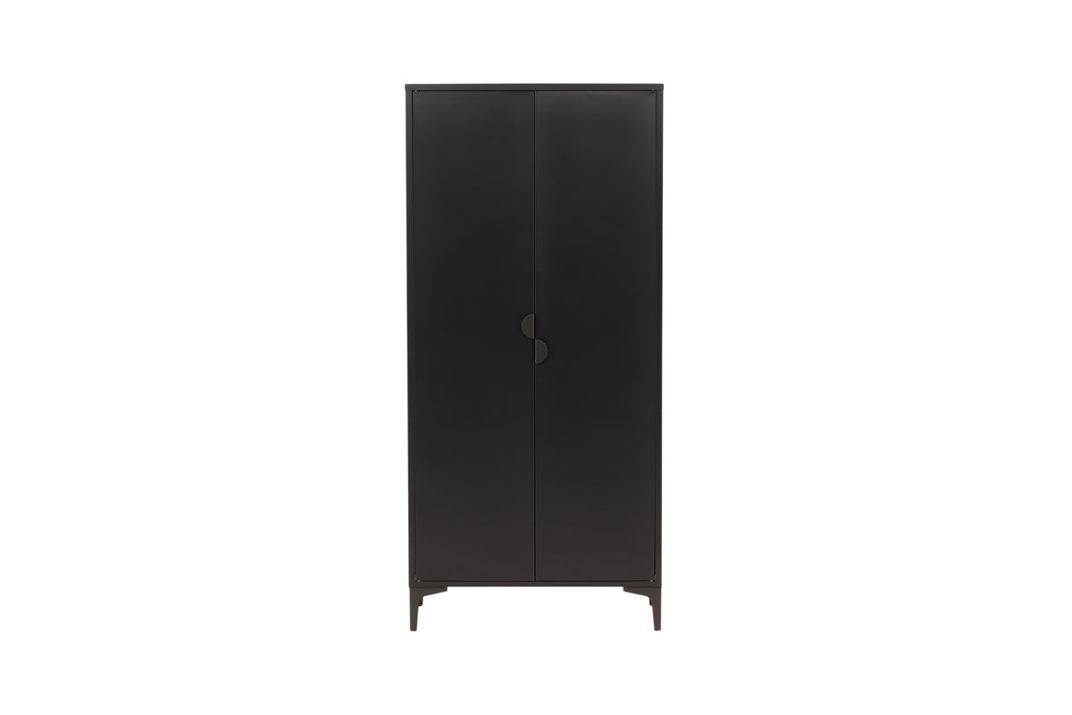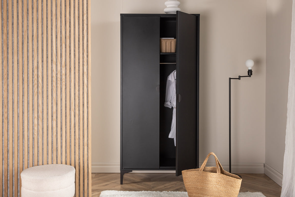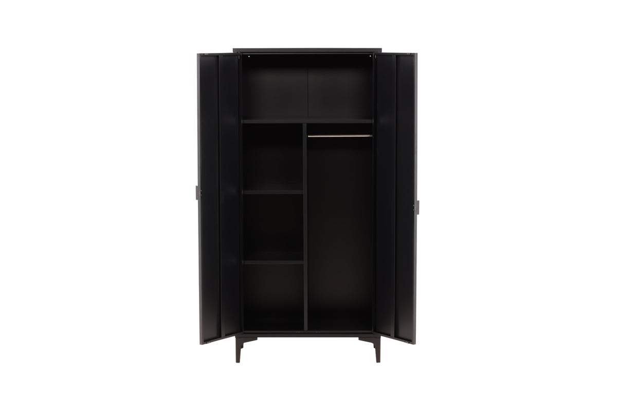 Fræk og tidløs - Garderoben fra serien Piring er det perfekte supplement til soveværelset! Dette høje klædeskab i sort stål har to døre, der åbner op til fire hylder og rummer også plads til bøjler, så det nystrøgne tøj slipper for at krølle. Piring løftes op af fire nette ben, som skaber et luftigt indtryk og også gør det nemmere for støvsugeren. Invester i mere opbevaringsplads til dig selv og få et flot møbel i dit hjem med i købet!