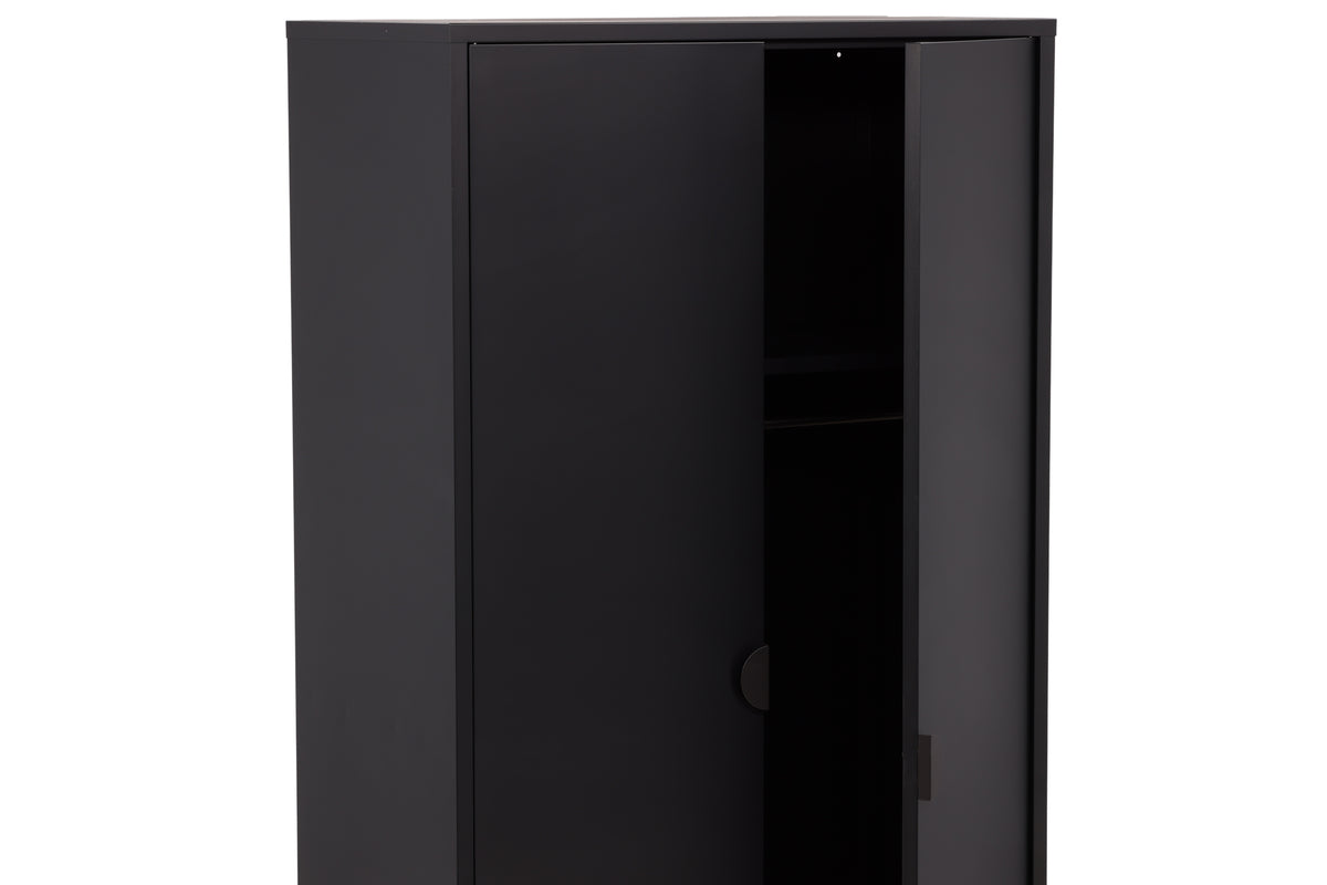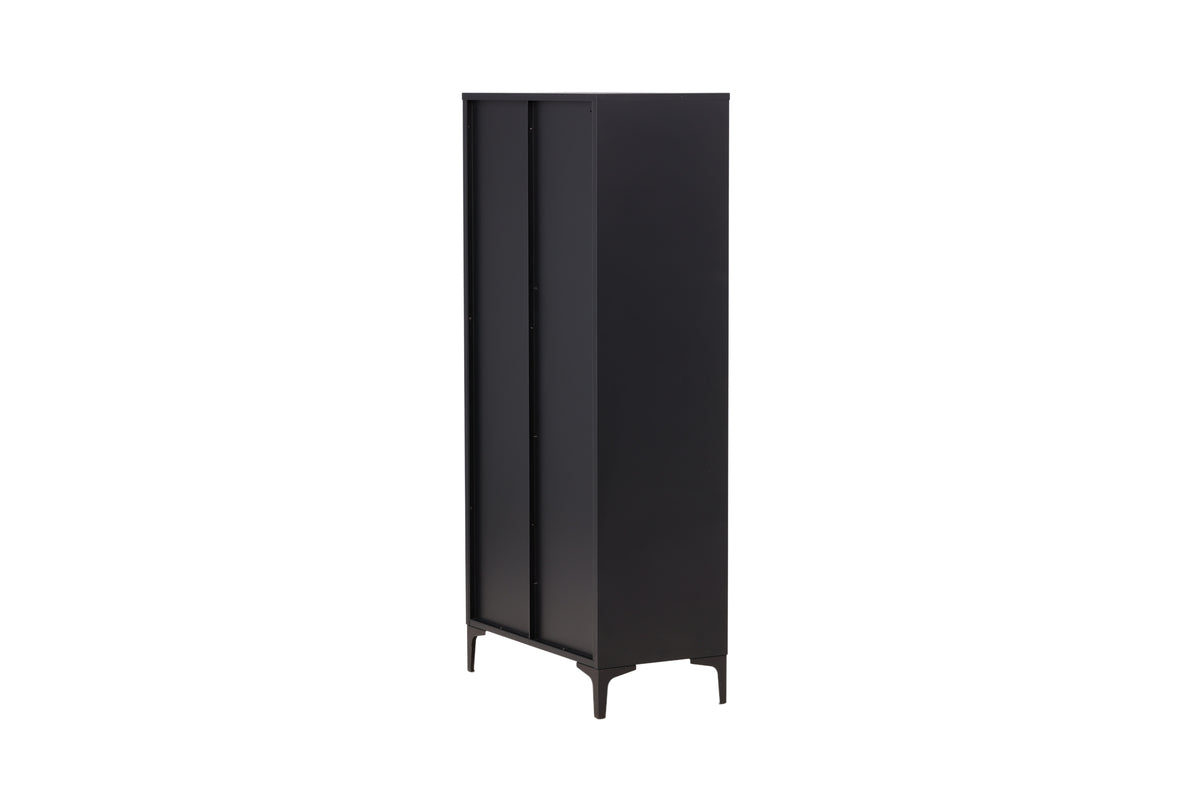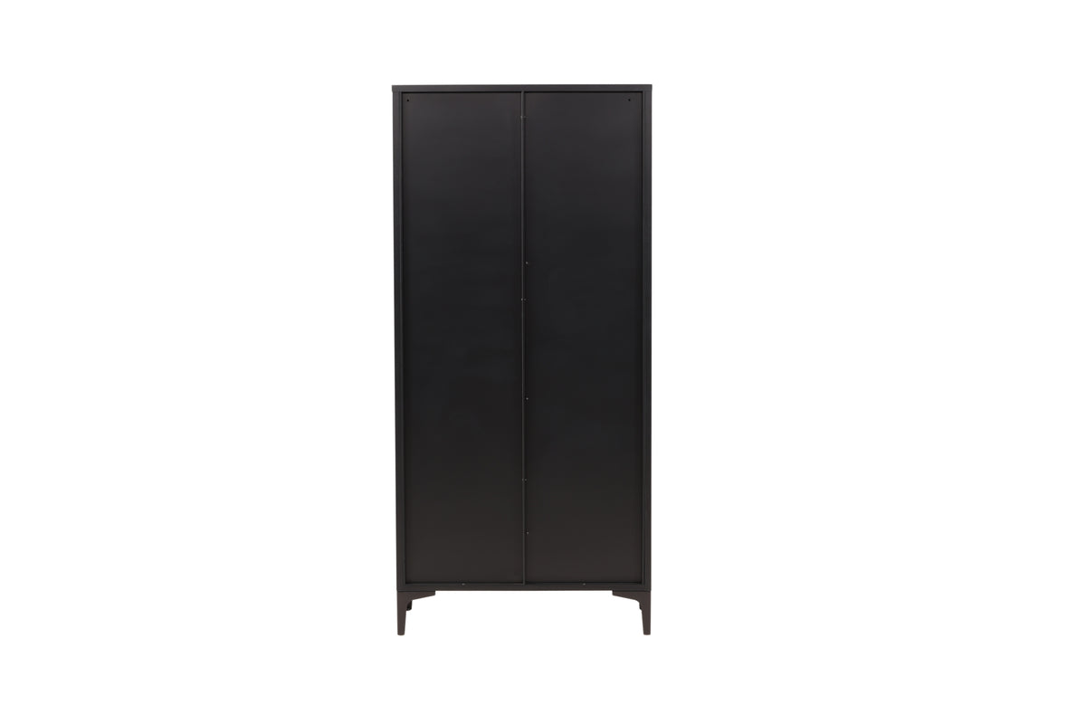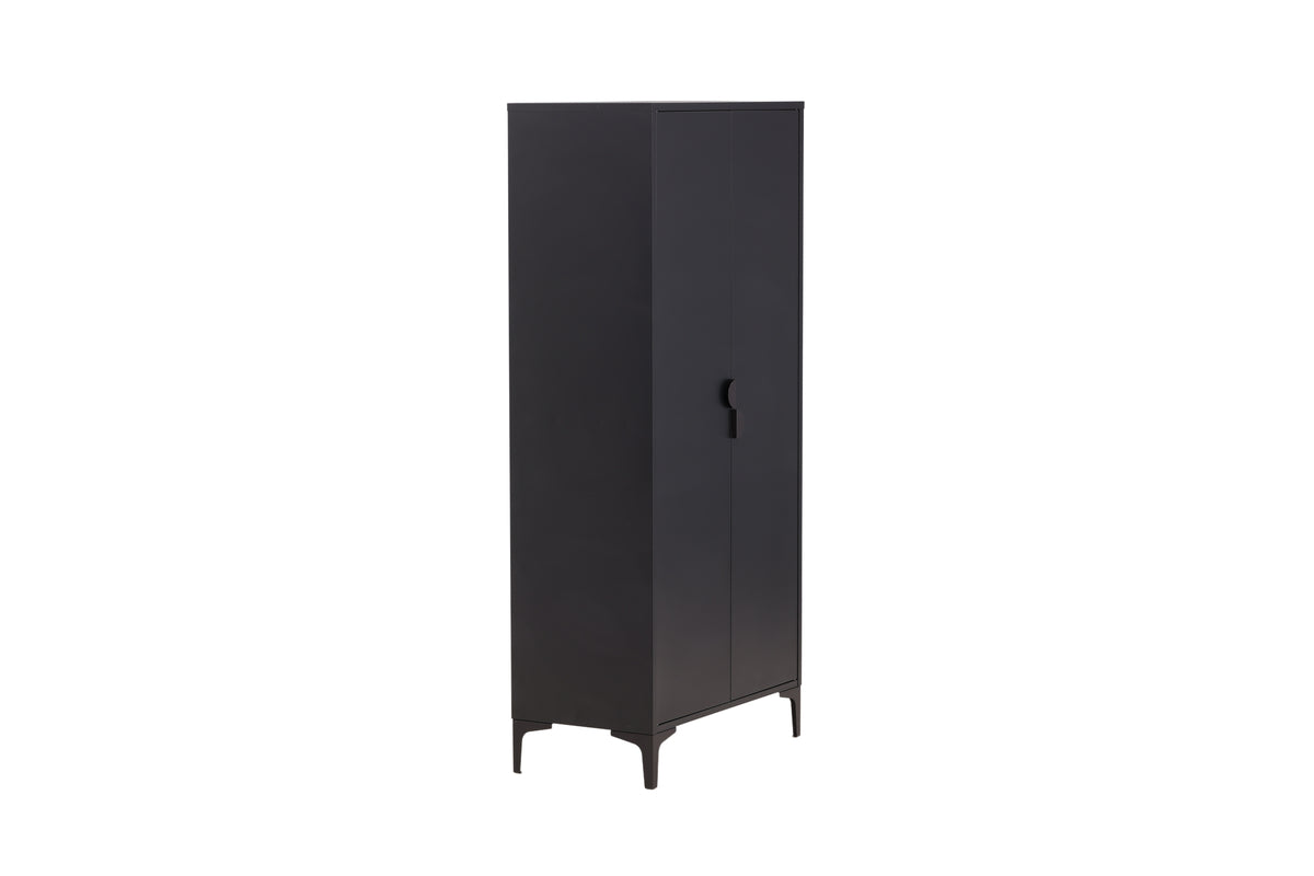 Fræk og tidløs - Garderoben fra serien Piring er det perfekte supplement til soveværelset! Dette høje klædeskab i sort stål har to døre, der åbner op til fire hylder og rummer også plads til bøjler, så det nystrøgne tøj slipper for at krølle. Piring løftes op af fire nette ben, som skaber et luftigt indtryk og også gør det nemmere for støvsugeren. Invester i mere opbevaringsplads til dig selv og få et flot møbel i dit hjem med i købet!