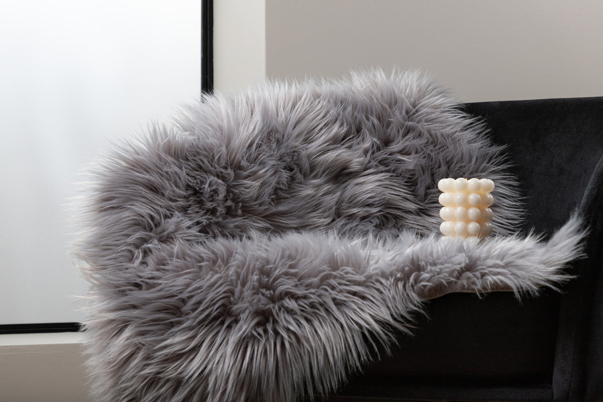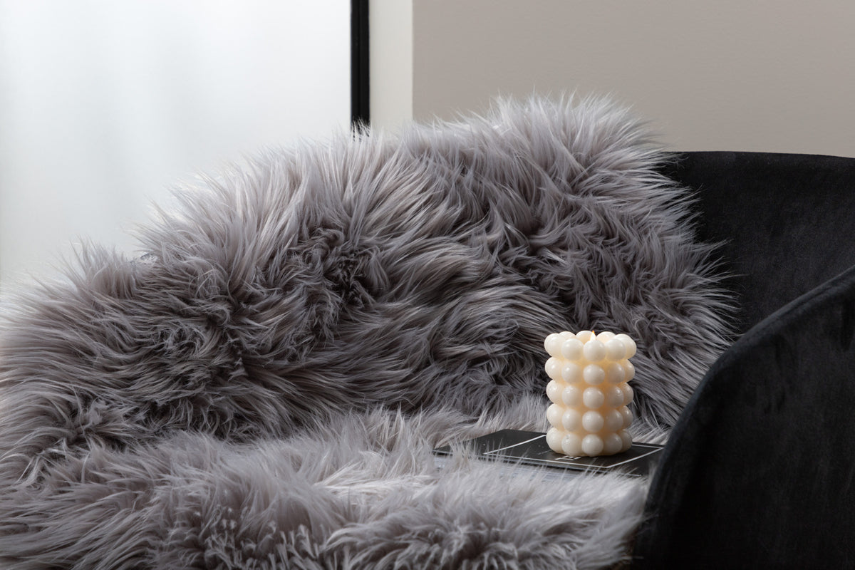 Indret dit hjem hyggeligt og varmt med en kunstpels i fåreskinds imitation. I tidløs grå farve og fluffy pels med langt hår har denne kunstpels mange anvendelsesområder - placer den ved siden af sengen, i sofaen, barnevognen eller på terrassen for et varmere indtryk. Fremstillet i slidstærkt polyester og akryl samt mockaimitation for et mere autentisk look. Mål: 60x90 cm.