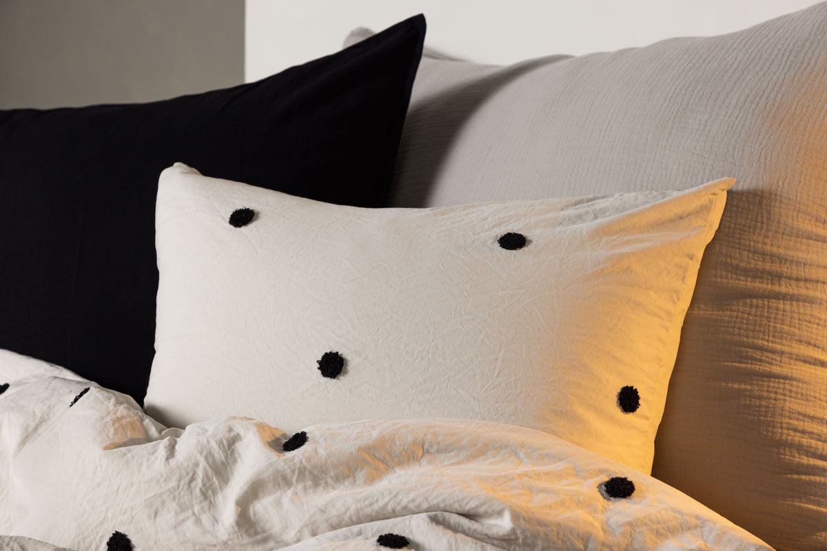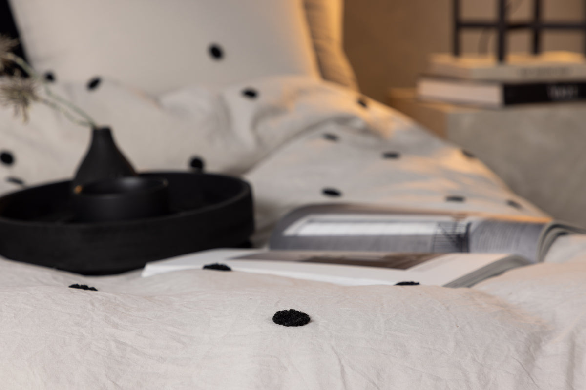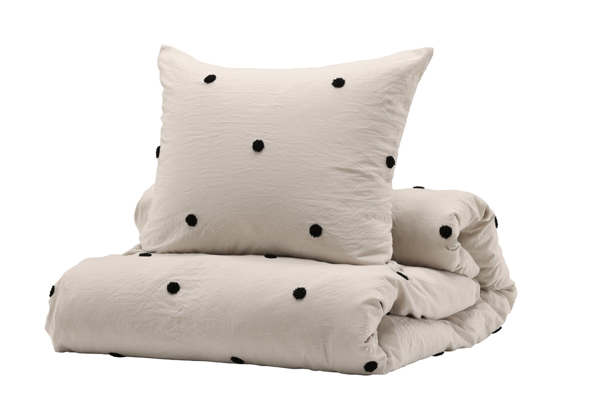 Dette sengesæt fra serien Loke er lige så hyggeligt at putte sig i, som det er skønt at sove på! Sengetøjet er fremstillet i det slidstærke og behagelige materiale microfiber, som er vaskbart og holder over tid. Sengesættet er lysegråt med sorte tuftede prikker, der skaber et livligt blikfang i trendy farver. Hyggeligt, pænt og skønt - hvad mere kan man ønske sig?