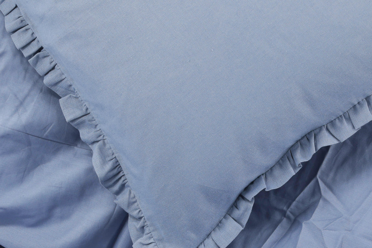 Red din seng charmerende med et flatterende sengesæt fra serien Lias! Dette bløde sengesæt i bomuldsvæv og hør har en smagfuld blå farve og lukkes med knapper forneden. Stoffet har en smuk flæsekant rundt om alle kanter, som bidrager til det hyggelige blikfang. Mål: 150x200. Vedligeholdelsesråd: Maskinvask 60 grader. Red luksuriøst og put dig ned i skønne lagner efter en lang dag!