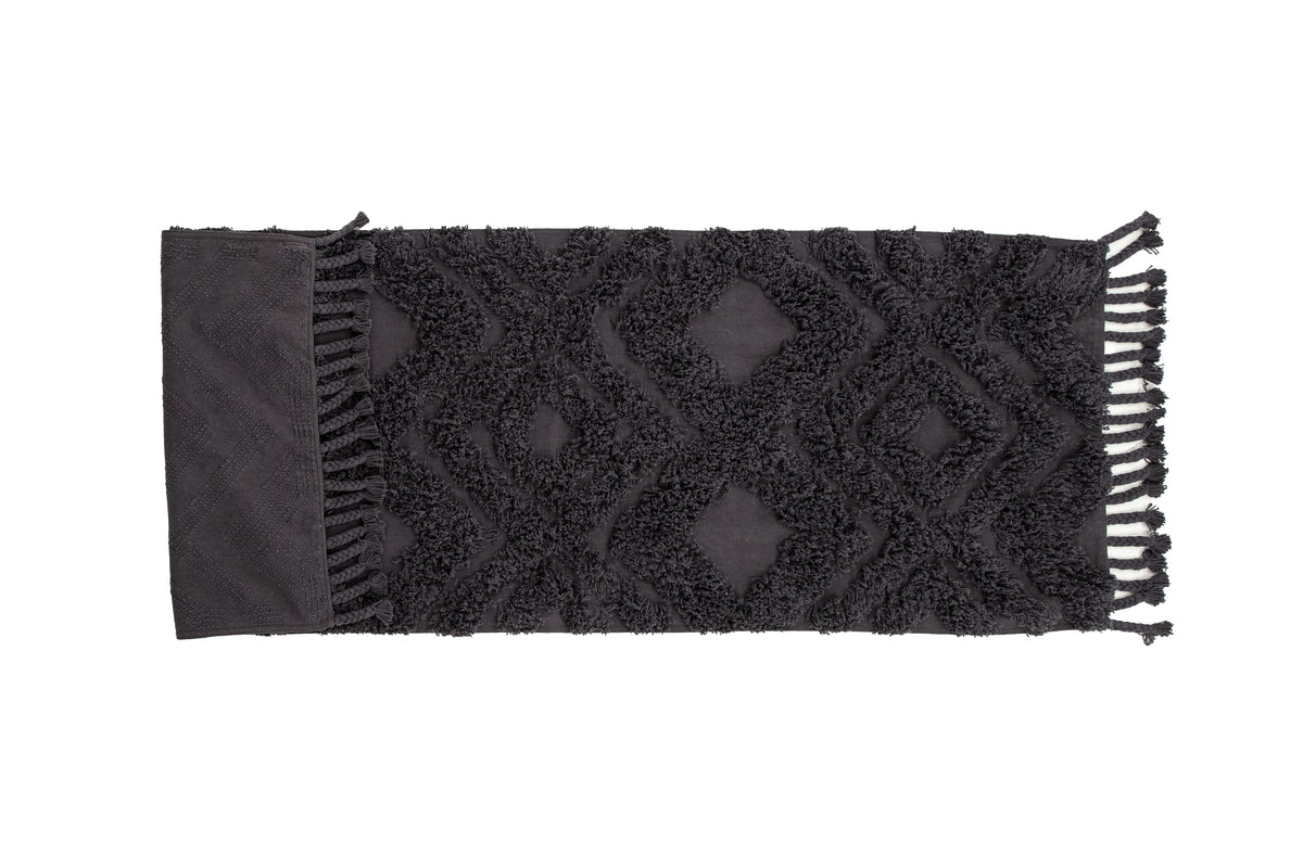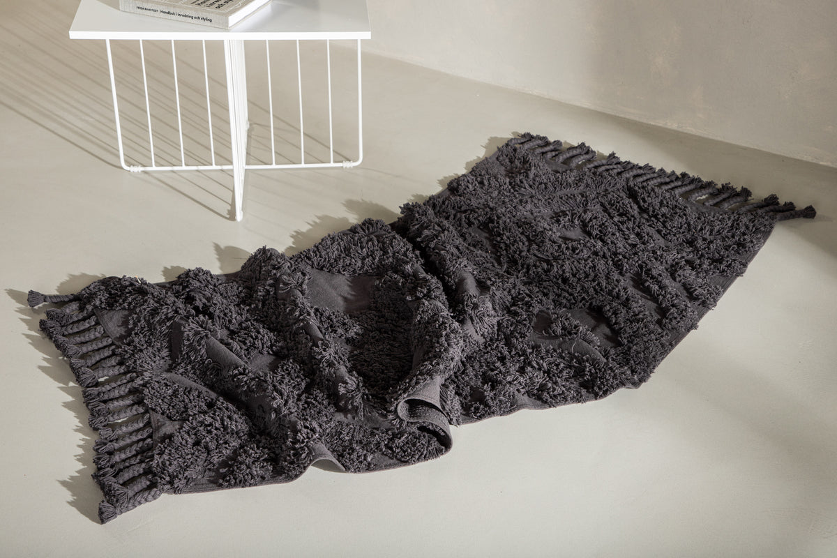 Skab en hyggelig atmosfære i dit hjem med et tæppe, der giver et moderne look til indretningen og en varmende følelse. Uldtæppet fra serien Hilma er en lang og smal, rektangulær tæppedrøm i moderne udgave, her i en sodet mørkegrå farve. Tæppet har et tuftet mønster i højere luv og en flettet frynserække langs kortsiderne, som bidrager til et klassisk design i kombination med det trendy. Materialets slidstærke egenskaber gør, at tæppet fungerer udmærket i de fleste rum. Placer det solitært i hallen eller i stuen for at løfte stilniveauet et par trin! Tæppets mål: 200x70 cm.