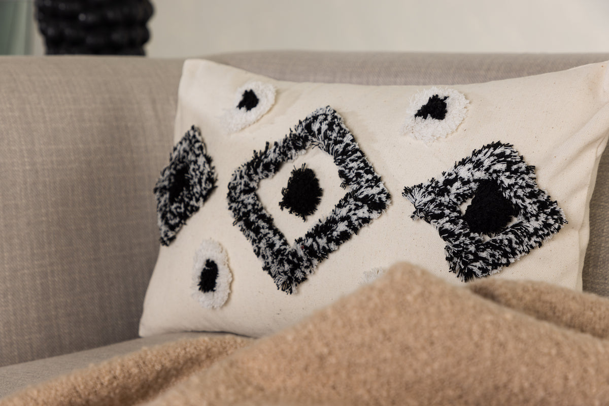 Melissa, vores populære pudebetræk, der kombinerer komfort med moderne mønstre! Dette aflange pudebetræk har en hvid farvebase og et abstrakt mønster i tuftet materiale i både hvid og sort farve. Fremstillet i en perfekt polyester- og bomuldsblanding, der er både smidig og slidstærk. Skab et flot blikfang i sofagruppen med en trendsikker pude, der nemt kan matches og kombineres med andre pudebetræk!