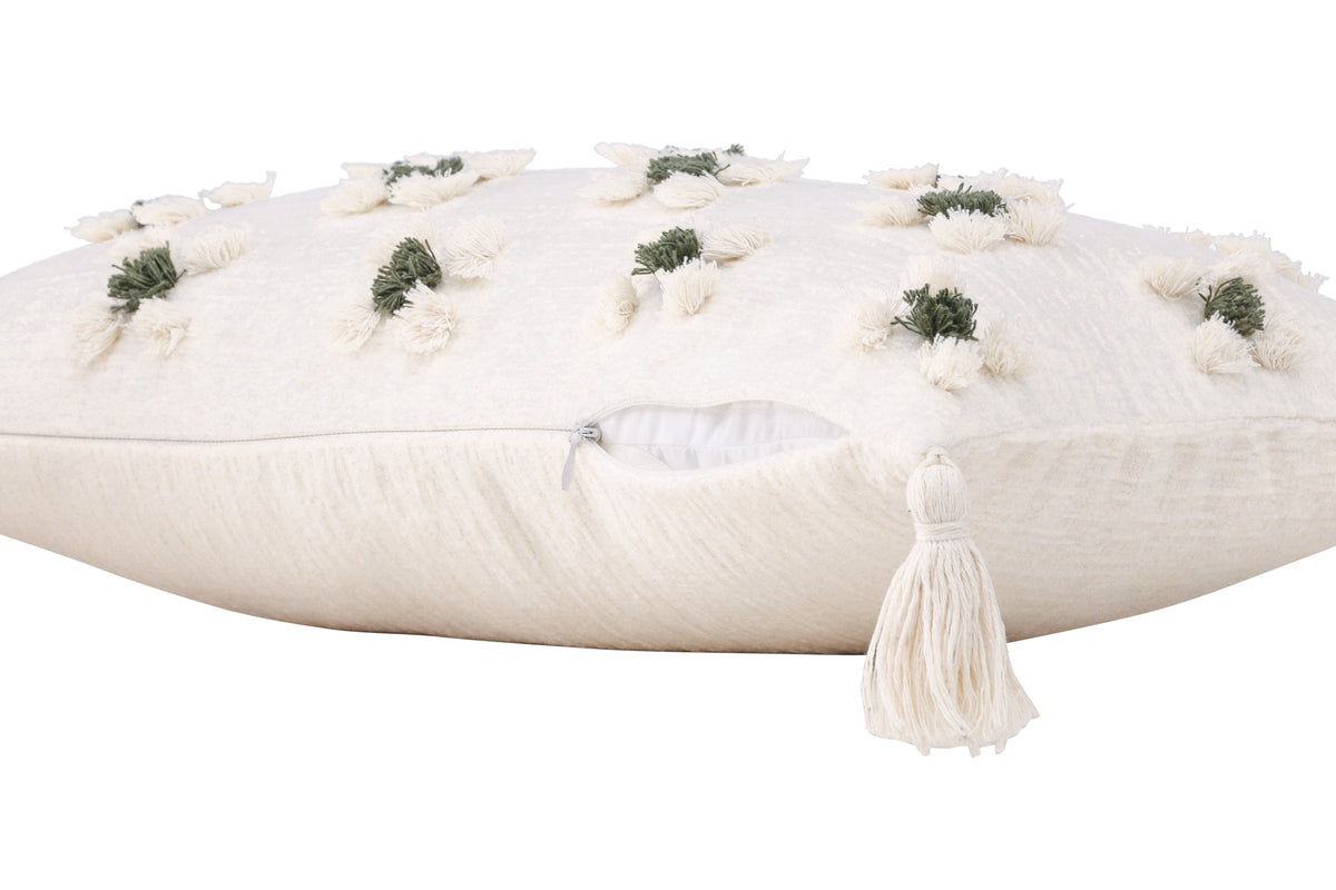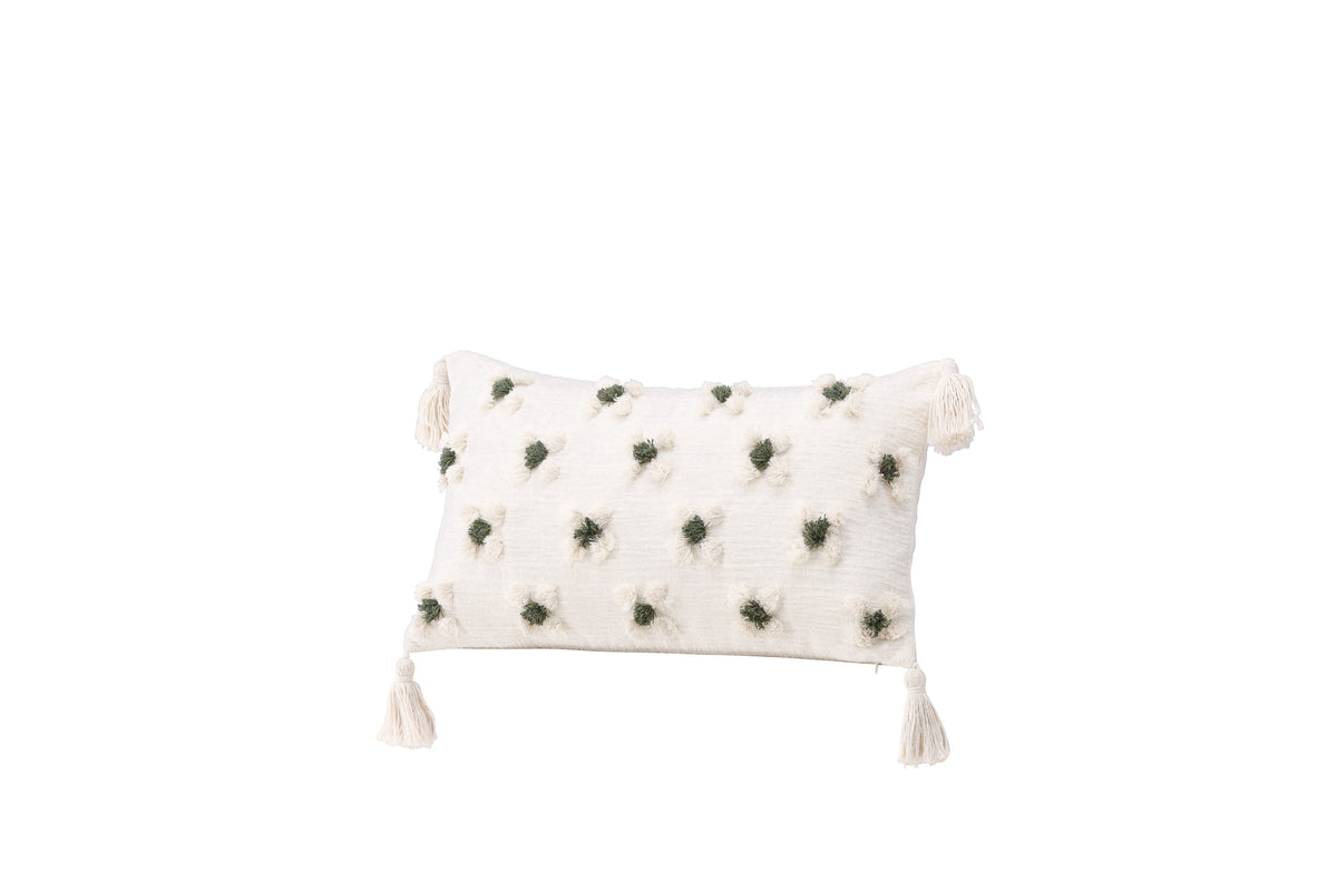 Pynt din sofa eller lænestol med en flot pude fra serien Millie i smigrende design! Dette aflange pudebetræk i beige grundfarve har et charmerende blomstermønster i tuftet grønt og beige stof, som giver en lækker struktur til puden. Med beige kvaster i hvert hjørne får puden et nostalgisk udtryk, og der er en skjult lynlås forneden. Stoffet er polychenille, hvilket bidrager til en smagfuld og slidstærk tekstur. Varm atmosfæren op i rummet med hyggelige puder!