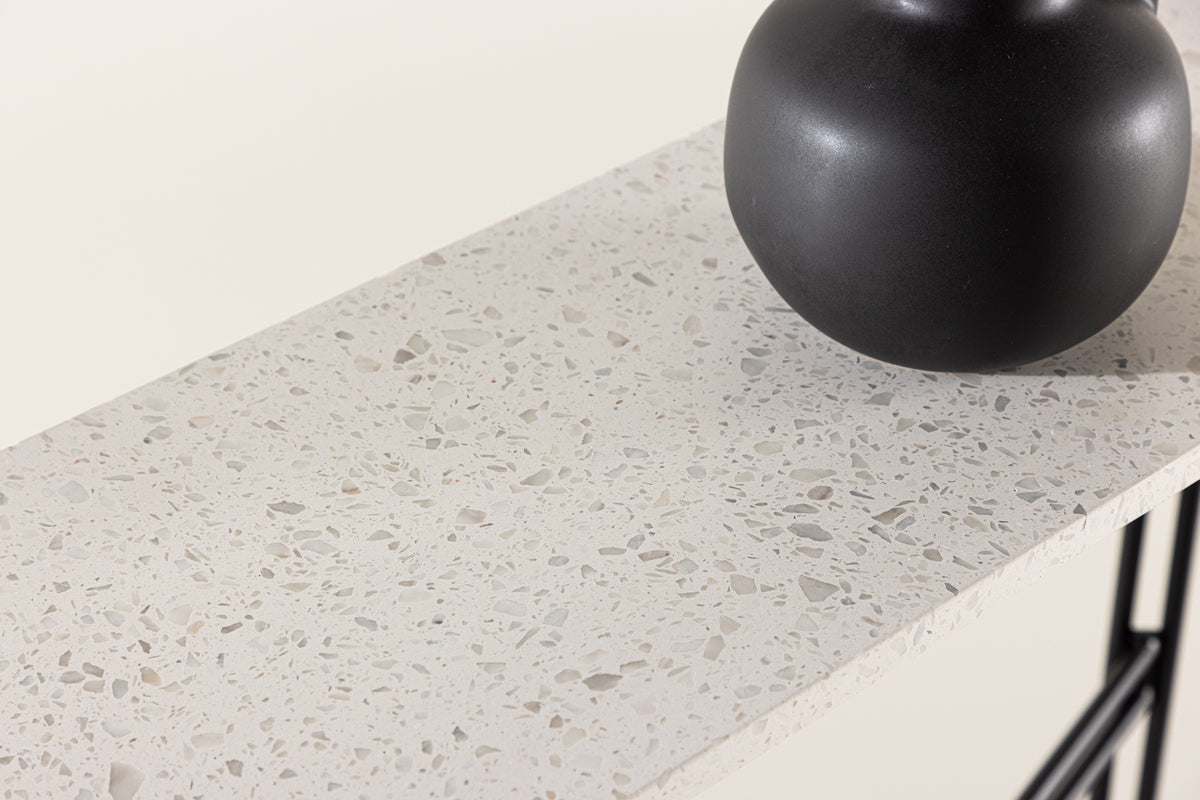 Dette sidebord klatrer op ad trendlisterne! Razzia er et moderne og praktisk sidebord med en hvid bordplade i spraglet terrazzo og understel i sort metal. Et aflastningsbord med et industrielt udtryk og et rent design. Med sine stilrene former tilfører bordet en moderne og luftig følelse til rummet og er utroligt anvendeligt både som opbevaringsflade og dekorativt sidebord. Perfekt til dig, der søger en fed indretningsdetalje til hjemmet!