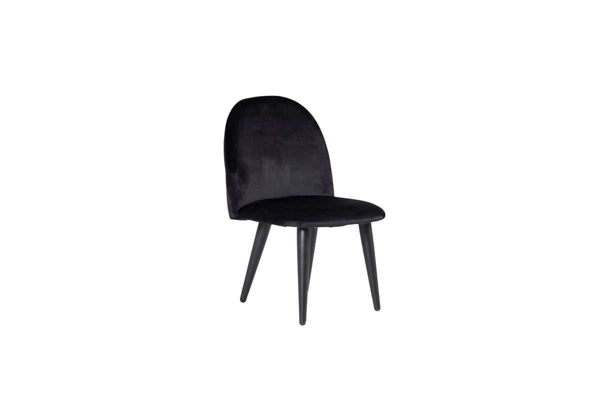 Spisebordsstol til børn i et fuldpolstret design med ben i hvidt pulverlakeret metal samt med en let afrundet ryg og sæde i polstret sort velourstof. Lettere montering kræves.