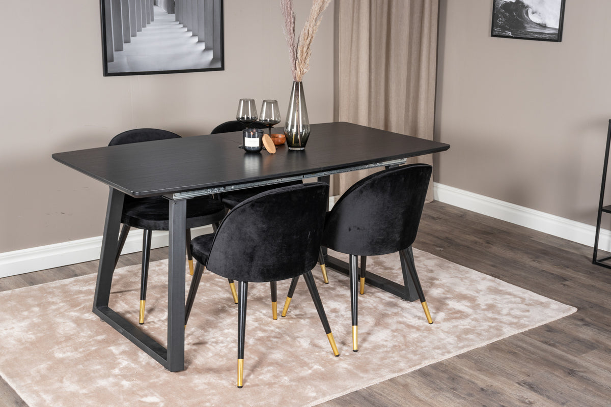 En elegant spisebordsstol med et luksuriøst præg! Velvet har et fuldt polstret design med ben i sort pulverlakeret metal og moderne messing-finish på benkapslerne. En blødt afrundet ryg og sæde i slankt sort velourstof med blød polstring for ekstra komfort. Nogle samlinger kræves. Invester i stole, hvor du ikke skal gå på kompromis mellem komfort og design! Plejeinstruktioner: Velour har en tendens til at få indtryk, når håret sætter sig. Indtrykkene kan få stoffet til at se slidt ud, hvilket er normalt for denne type materiale. Afhængigt af hvordan lyset falder, kan stoffet fremstå i flere forskellige nuancer.