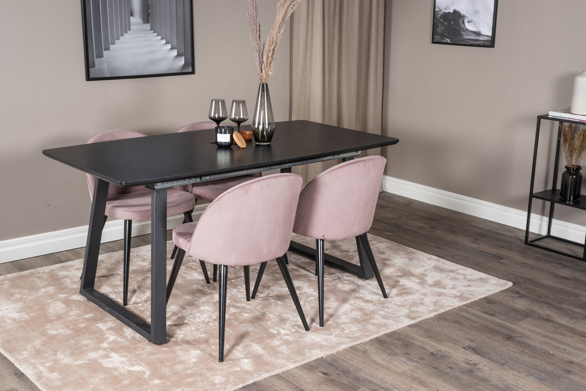 En trendy spisestol i blødt gammel rosa manchester stof vil helt sikkert skabe en hyggelig atmosfære i din stue! Spisestolen Velvet har et fuldt klædt design, ben i sort pulverlakeret metal og afrundet ryg og sæde med blød polstring for ekstra komfort. Lettere samling er påkrævet. Her sidder du komfortabelt og behageligt i timevis! Plejevejledning: Brug tekstilspray til at imprægnere tekstilet, før du begynder at bruge det, det vil også gøre eventuelle snavs og pletter lettere at fjerne i fremtiden. Fjern pletter med det samme, gnid ikke, men prøv at suge forsigtigt op med en klud.