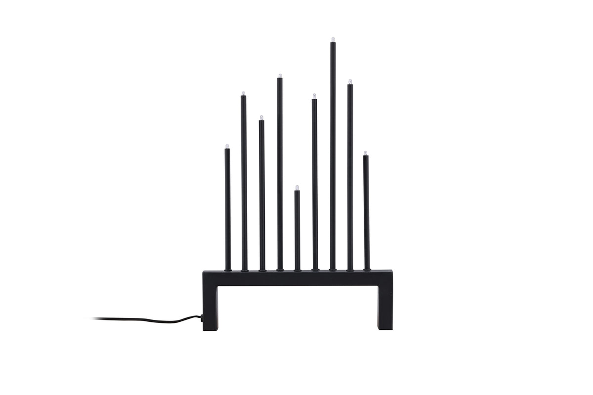 Tænd Vallåsen bordlampen og skab en stemningsfuld atmosfære med denne fantastiske moderne designede adventlysestage! Vallåsen lampeserien er kunstnerisk designet til at ligne formen af en uregelmæssig adventlysestage, men den tager det til et nyt niveau med små lys i varierende højder, der udsender et subtilt og smukt skær. Dette bliver et elegant og stilfuldt detalje, der kan pryde ethvert rum. Lavet af sort stål i minimalistisk stil. Det, der gør Vallåsen endnu mere fantastisk, er dens alsidighed i brug. Placer den på dit skrivebord for at skabe en rolig og fokuseret atmosfære, mens du arbejder eller studerer. Eller hvorfor ikke sætte den på vindueskarmen for at sprede lys og glæde til forbipasserende? Bedst af alt - den fungerer perfekt hele året rundt og behøver ikke at være begrænset til decemberhøjtiderne! Dimensioner: 42x27x6cm.