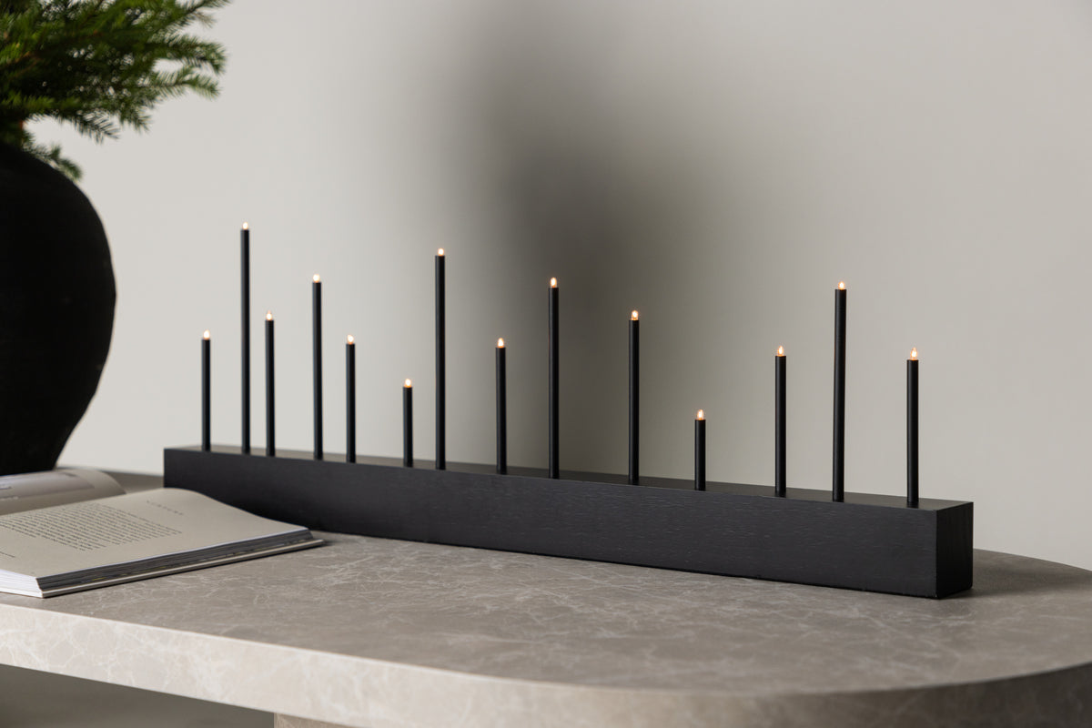 Velkommen hjem til en hyggelig atmosfære takket være vores slanke bordlampe, Kungsberget! Med sit lave og moderne design er denne fantastiske sorte lysestage et perfekt interiørdetalje, der vil give dit hjem et elegant præg. Denne lampe er kunstnerisk designet med en rektangulær base i sort MDF, der understøtter fjorten små lamper i sort metal i forskellige højder. Dens elegante og slanke udseende gør den til et perfekt passende detalje i ethvert moderne hjem. Den er simpelthen ideel som bordlampe og fungerer lige godt i soveværelset, stuen eller kontoret. Med denne bordlampe vil dine mørke aftener forvandles til hyggelige øjeblikke fyldt med varmt skær og stemningsfuld atmosfære. Nyd roen og hyggen, som denne lampe bringer til dit hjem, og gør dig klar til at imponere dine gæster med et skær, der får dem til at føle sig velkomne og afslappede! Dimensioner: 27x77x6cm.