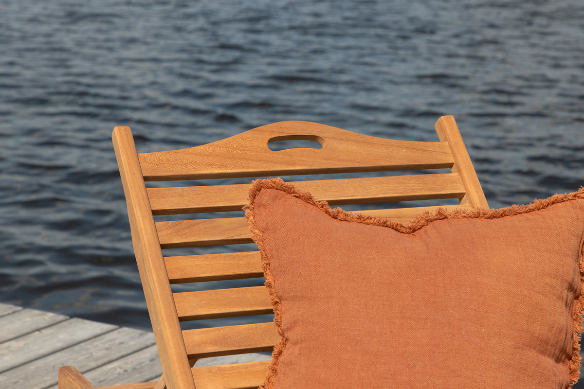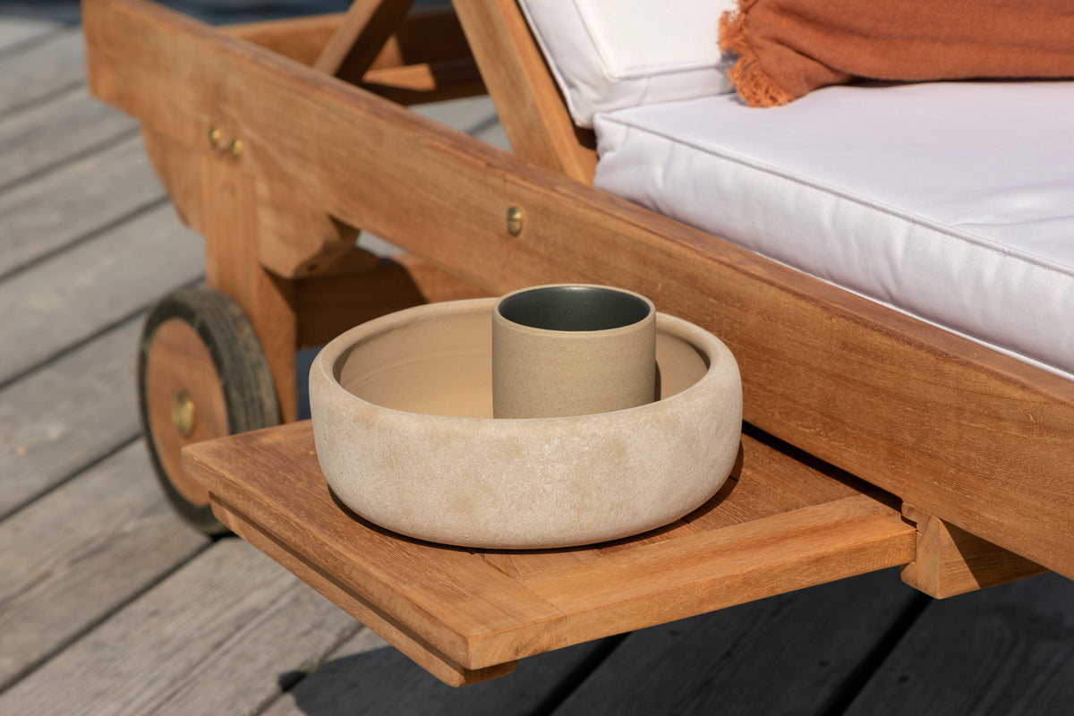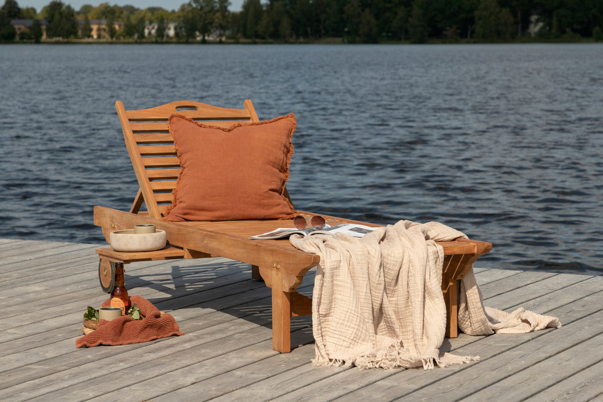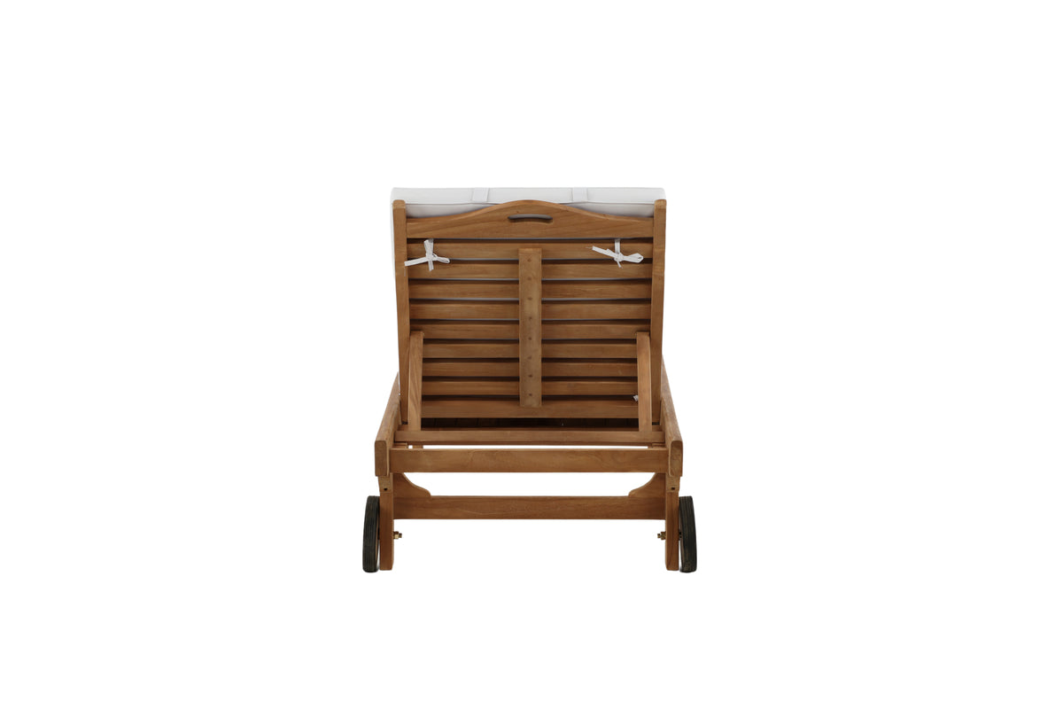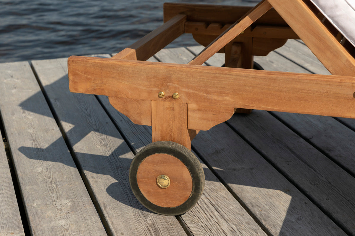 Slå dig ned i vores skønne solseng i serien Ghana og nyd solen! Solsengen er fremstillet i teak og har en dyb træfarvet nuance. Solsengen indbyder til afslapning og bekvemmelighed, og med sin tilhørende bakke passer den perfekt ind på terrassen eller altanen, når du vil kunne lægge bogen fra dig og nyde stunden! Hynde er ikke inkluderet.