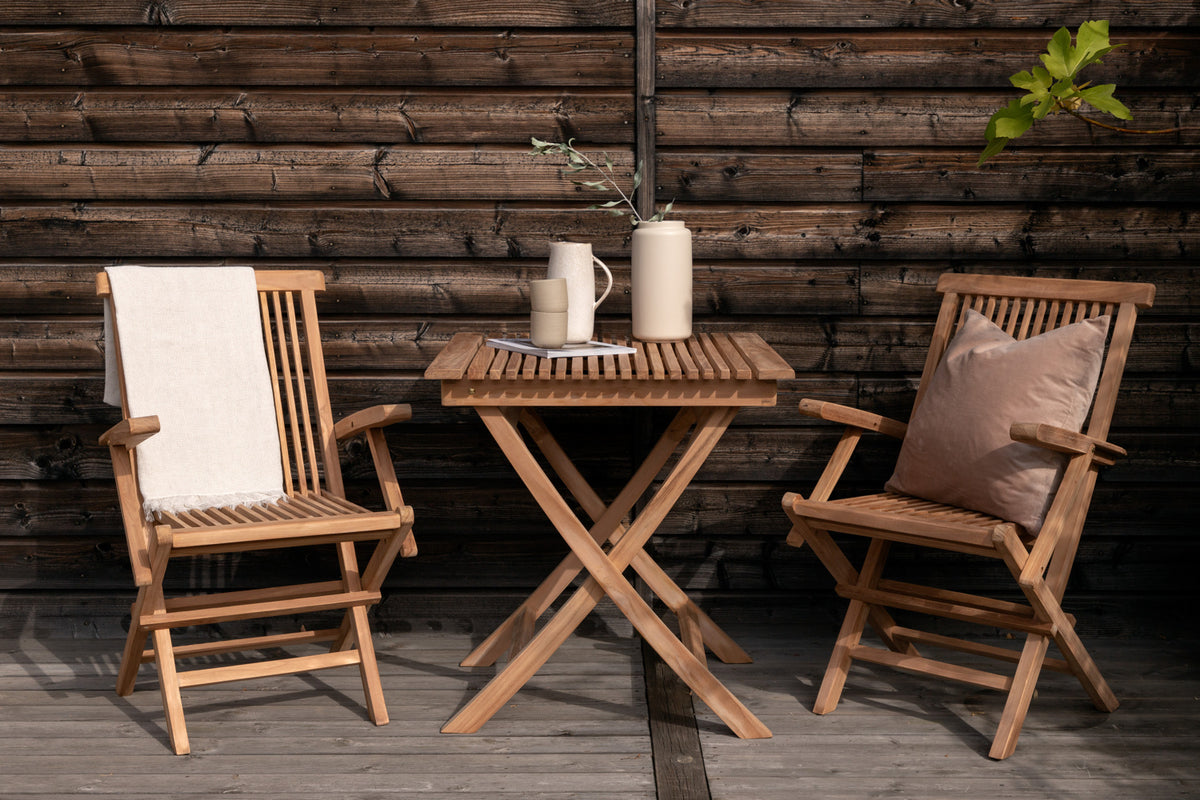 Vores teakmøbler er produceret af certificeret teak, der er dyrket til formålet og ikke fældet fra skrøbelig regnskov. Som en af de mest holdbare træsorter indeholder teak meget olie, hvilket er nødvendigt for at materialet ikke skal revne. Eftersom træsorten naturligt indeholder meget, behøver møblerne ikke imprægneres lige så ofte.
