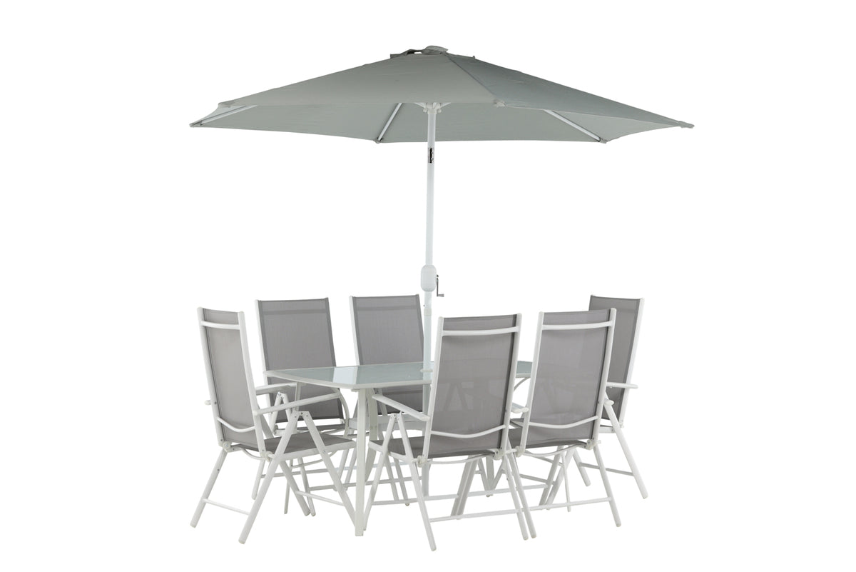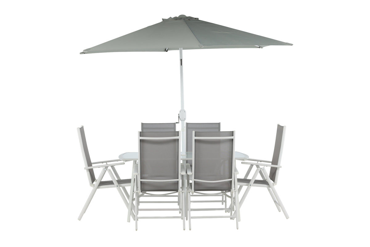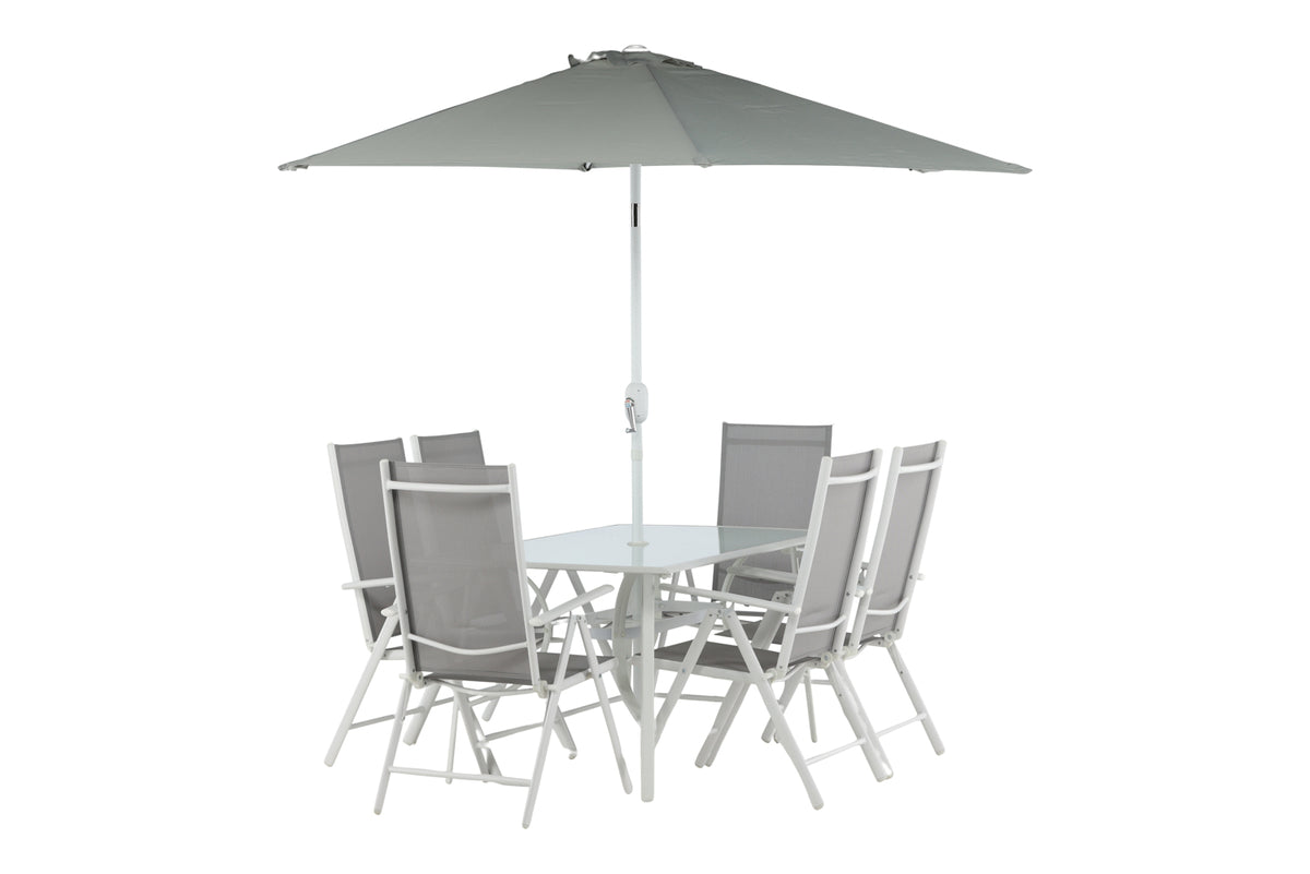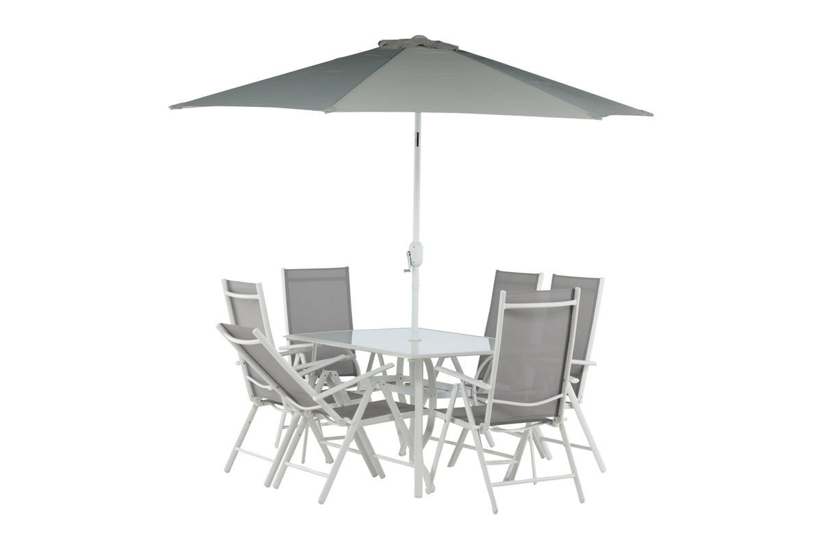 Køl af i skyggen i et moderne spisesæt under en smart parasol! Brekki spisesættet tilbyder både et stilfuldt spisebord med en glasplade og lige ben i hvid aluminium. Her sammen med foldbare spisestole med sæde i grå textilene og ramme i hvid aluminium. Parasollen er fastgjort i midten af bordet og beskytter dig mod solens varme stråler under middagen. Parasollen har et hvidt stof med en aluminiumsramme. Det bliver ikke bedre end dette!