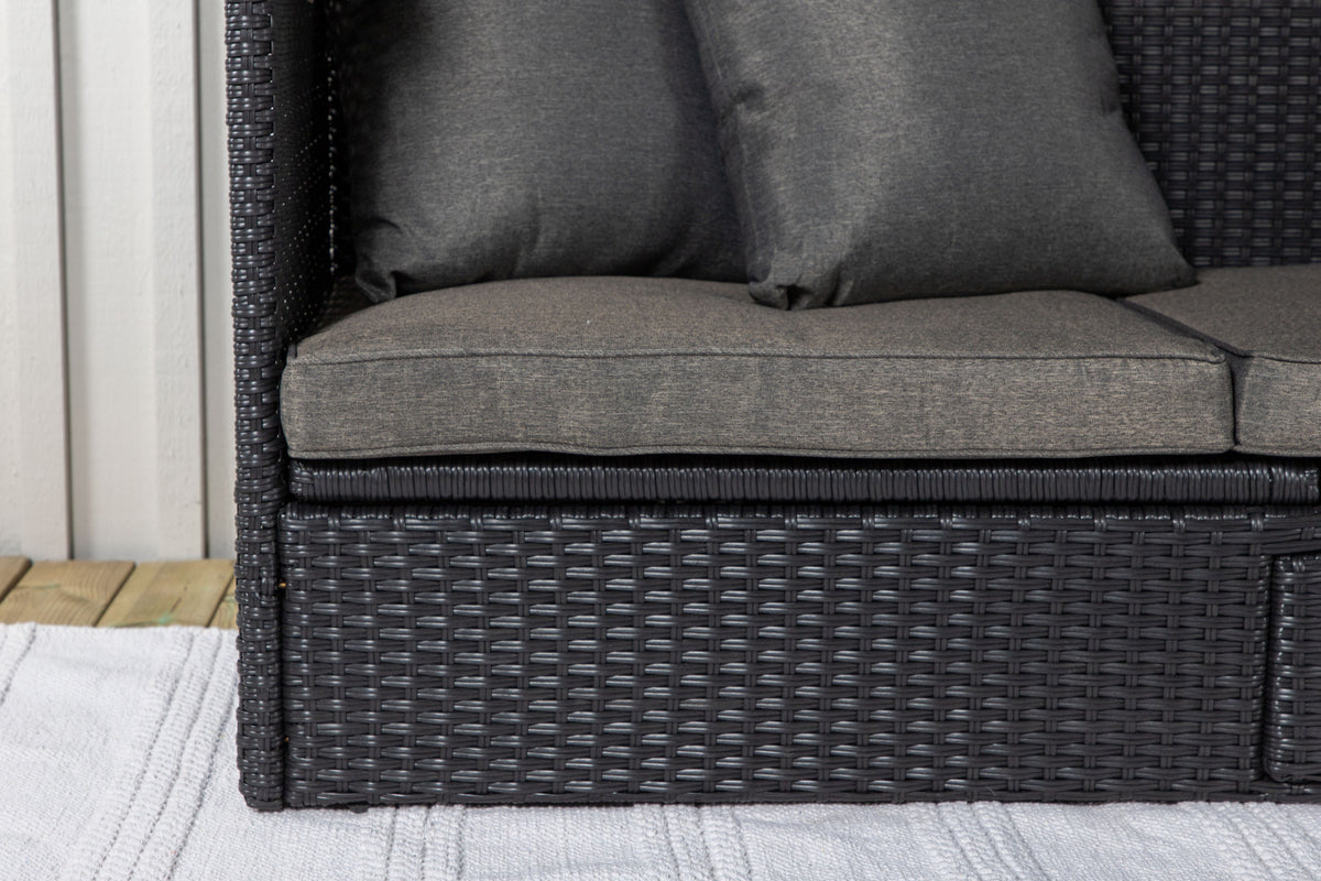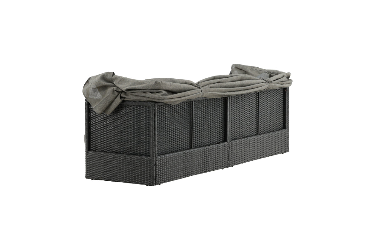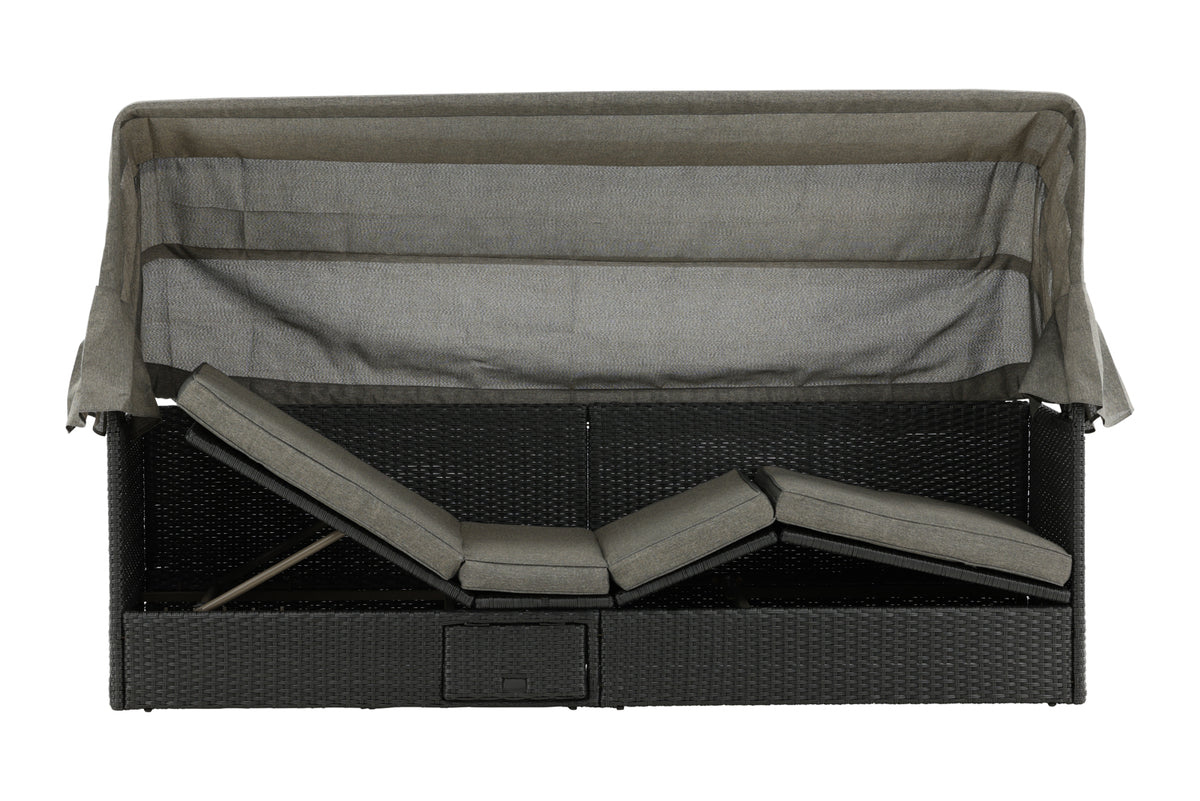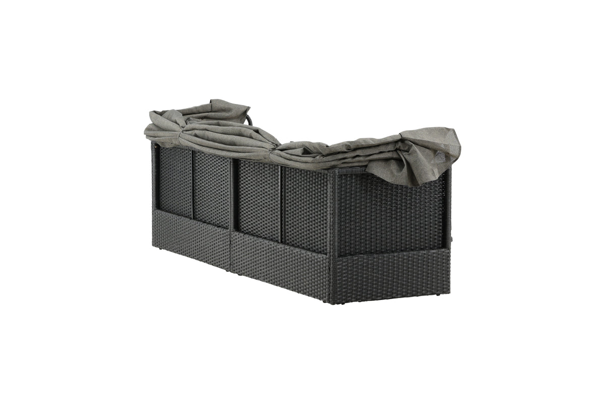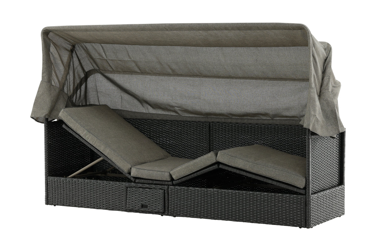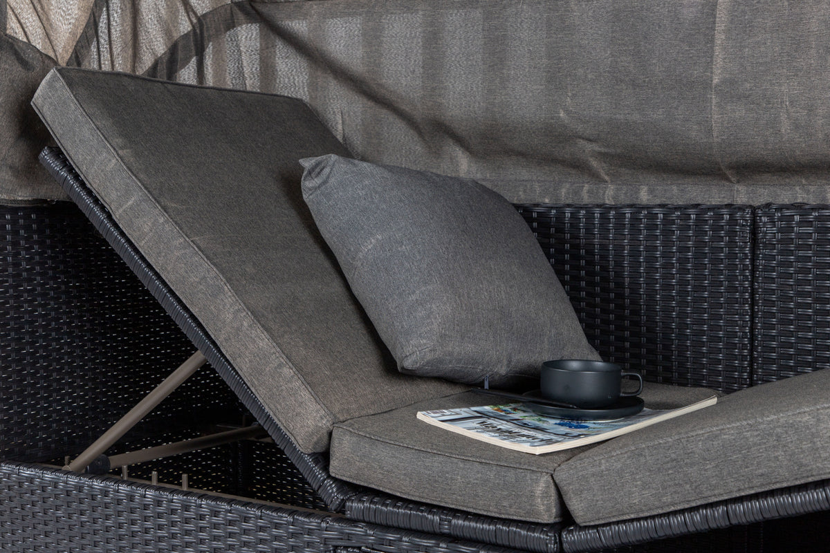Nyd dovne dage i solen i vores solseng Nopy! Solsengen er lavet af kunstige rattan, og med den dejlige parasol kan du nemt vælge, om du vil ligge i skyggen eller i solen.