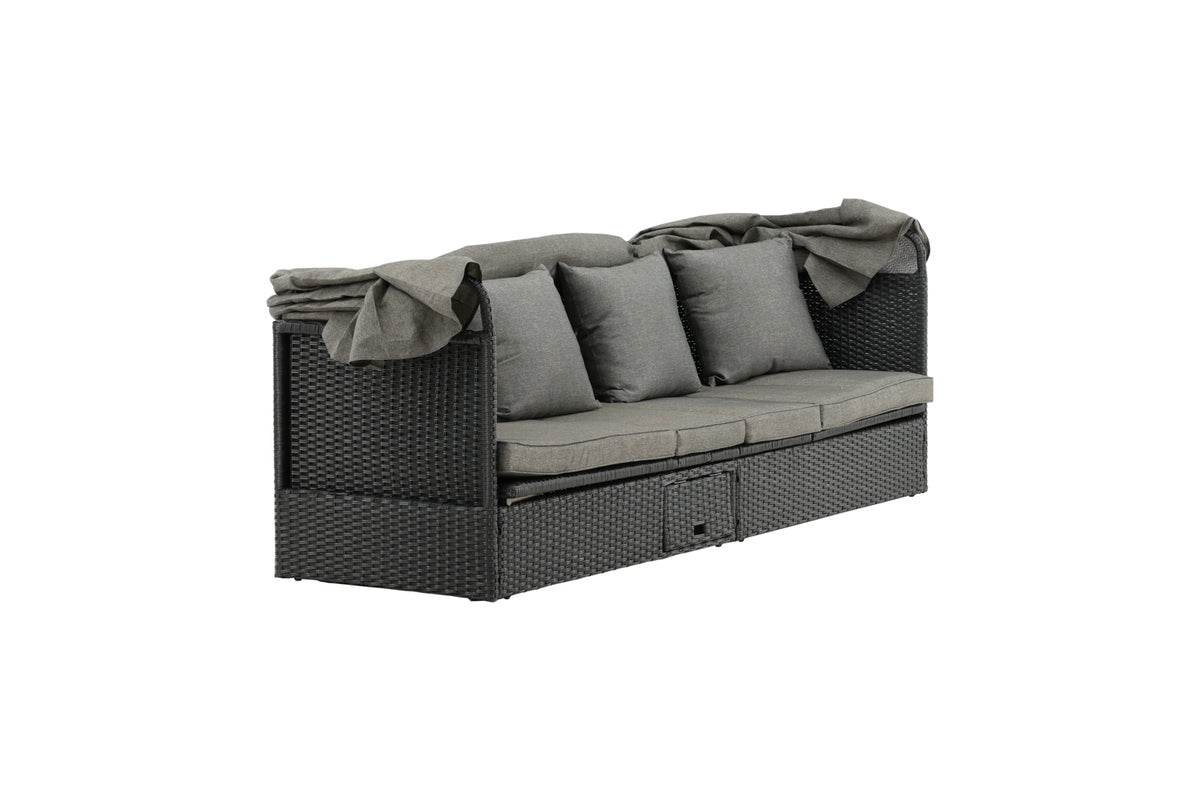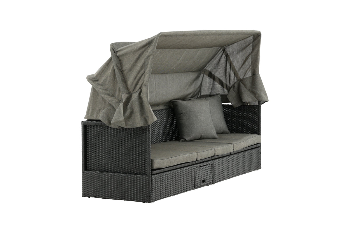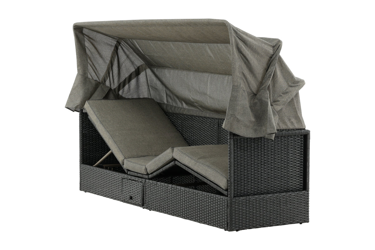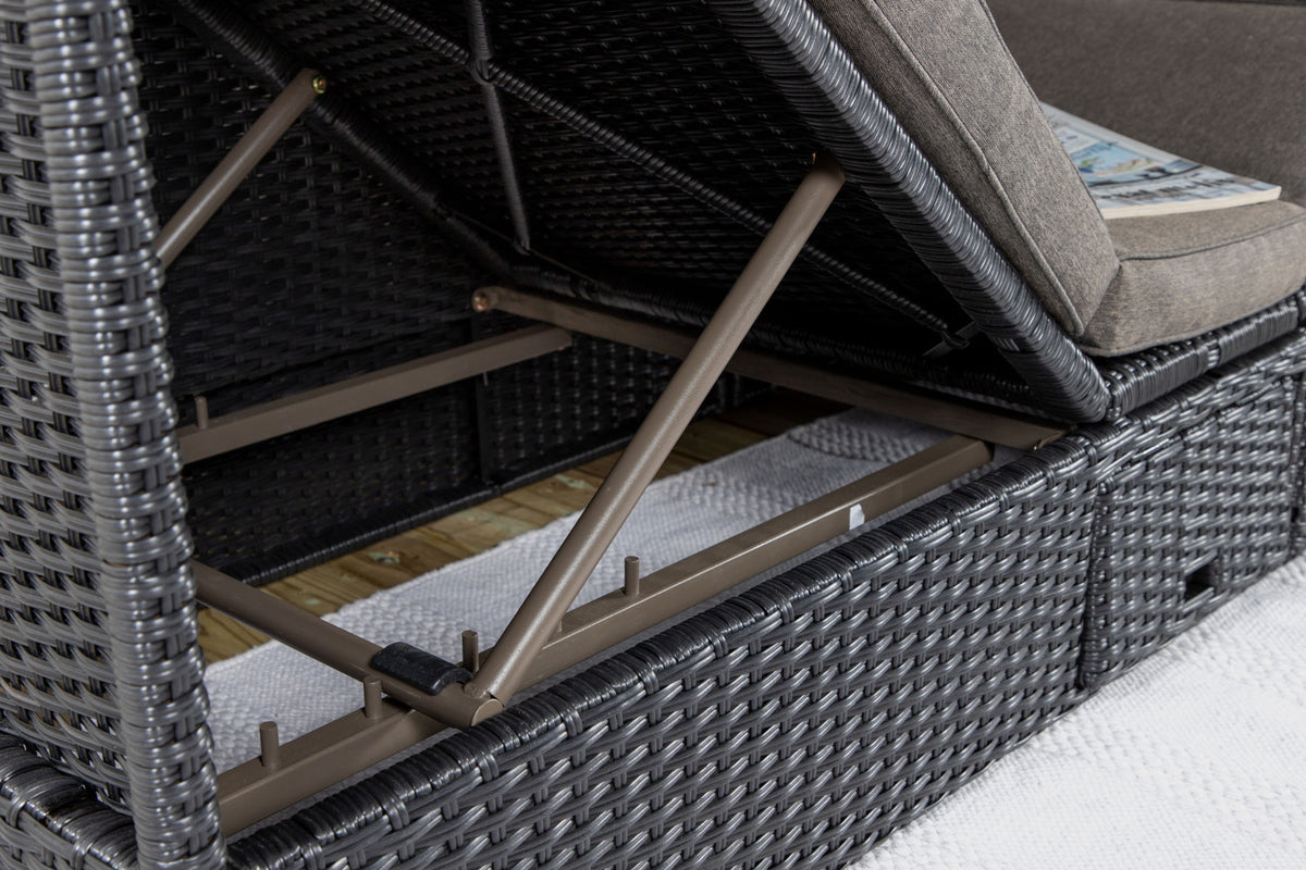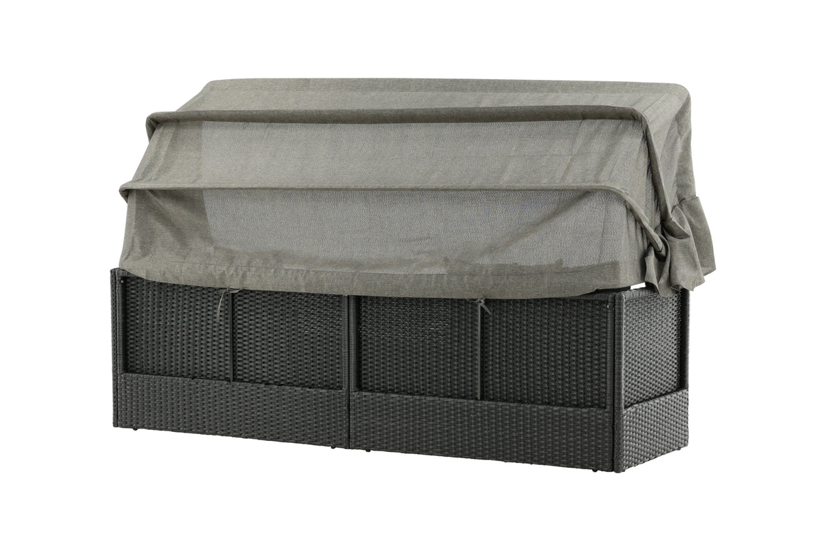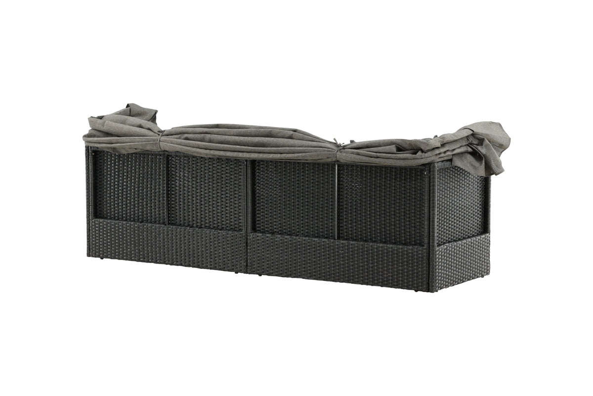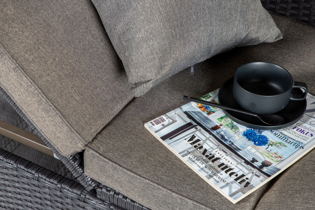 Nyd dovne dage i solen i vores solseng Nopy! Solsengen er lavet af kunstige rattan, og med den dejlige parasol kan du nemt vælge, om du vil ligge i skyggen eller i solen.