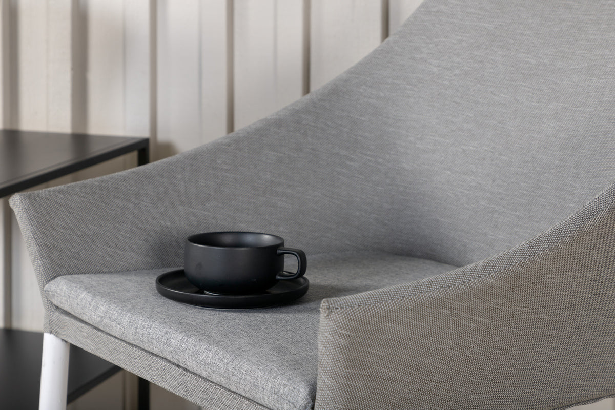 Sid behageligt i spisestole fra serien Spoga! En armstol i et robust, fuldpolstret design med ben i hvidt pulverlakeret metal. Ryglæn og sæde med integrerede armlæn i gråt polyesterstof har skøn siddekomfort og behagelig siddedybde. Match med et flot spisebord, så får du en komplet spisegruppe til enten udestuen eller terrassen!