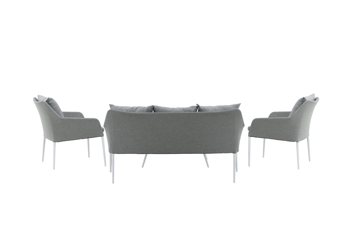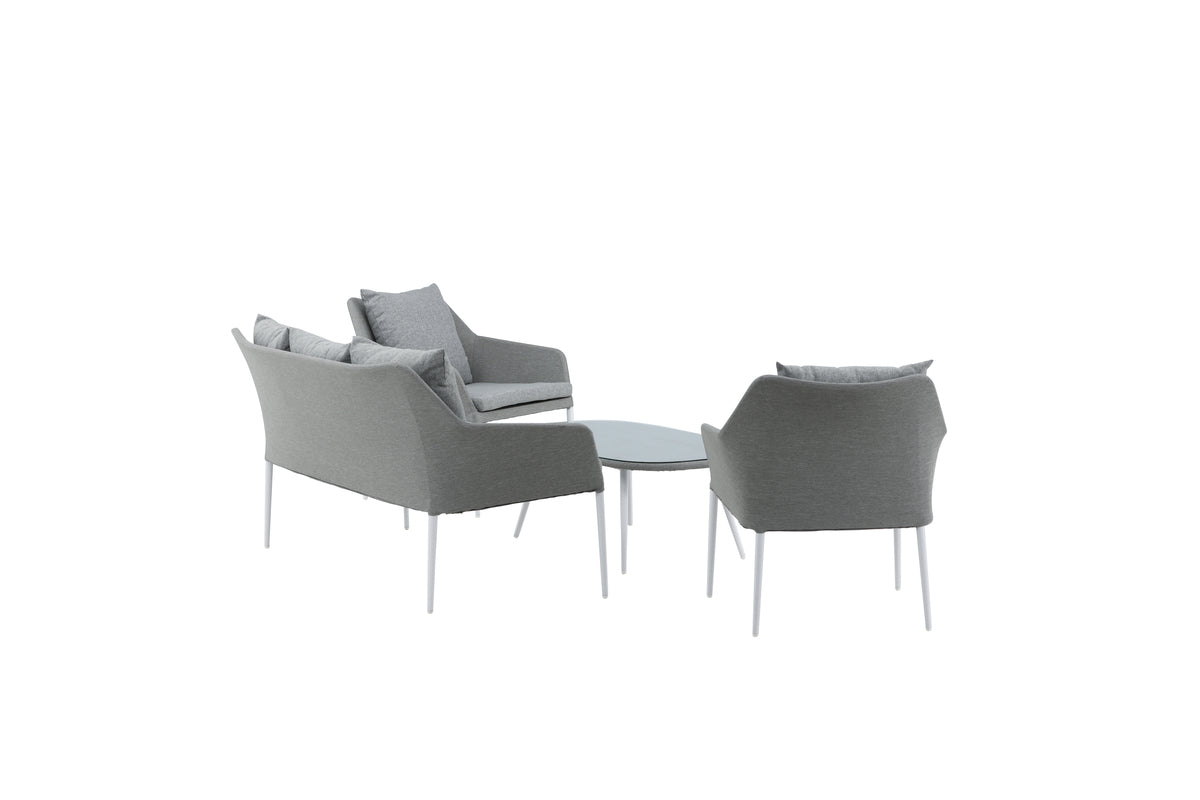 Spoga sofagruppe har et luftigt design med lige, nordiske former, der vil passe perfekt på terrassen eller i udestuen til sommer! Stellet er hvidt, og sædet er fremstillet af gråt stof. Et matchende sofabord medfølger - møblér indbydende og personligt!