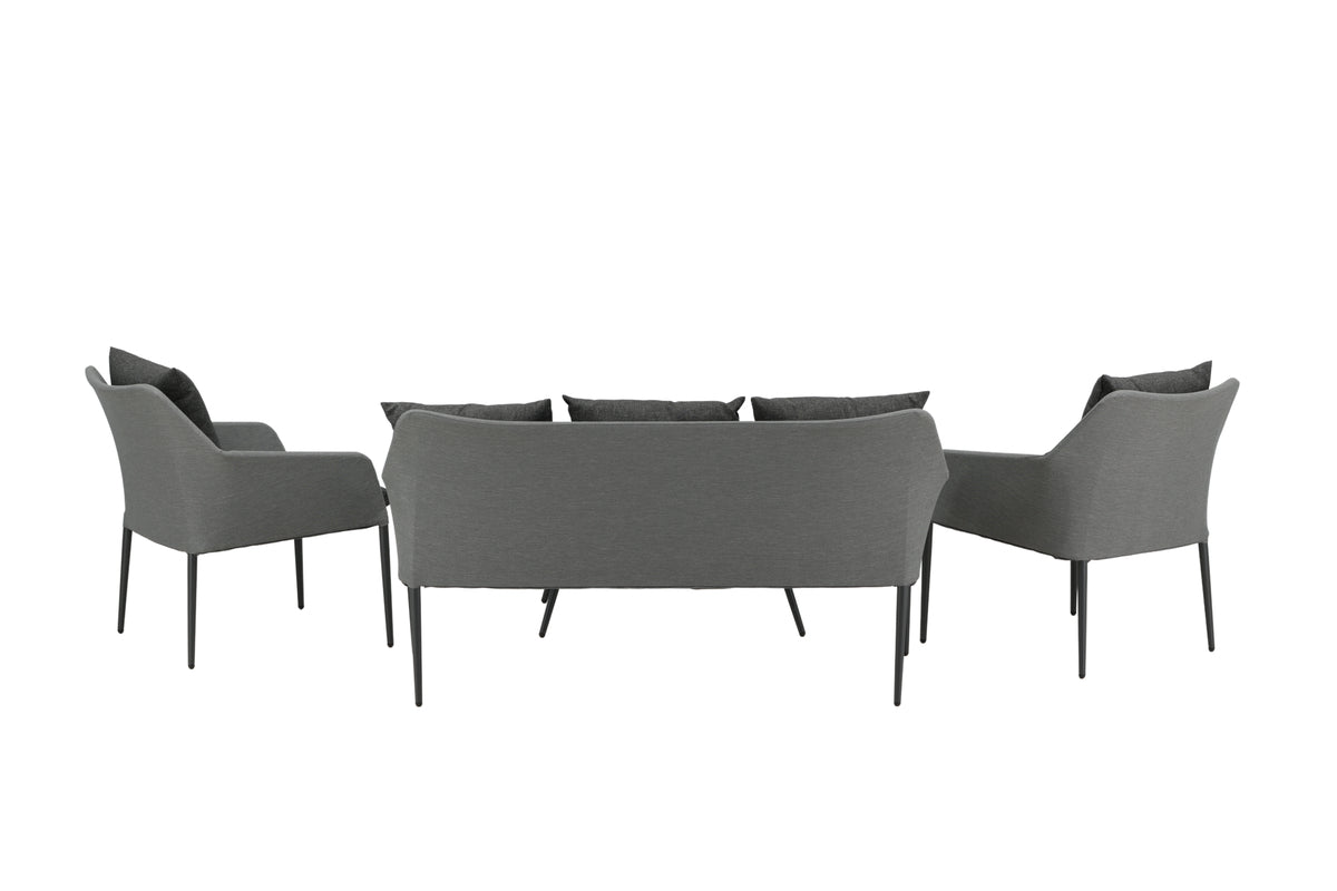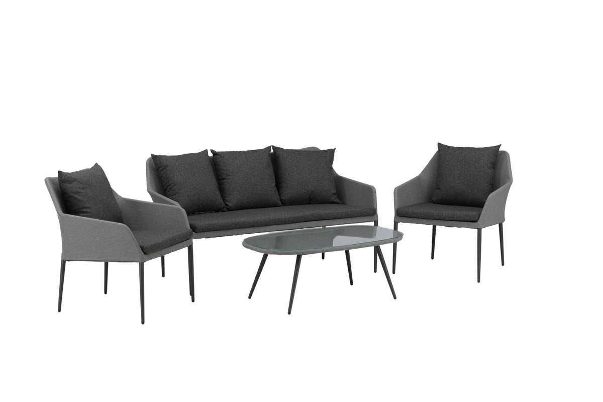 Spoga er en moderne loungesæt med fokus på komfort – den passer perfekt på terrassen eller altanen. Møbelgruppen består af en to-personers sofa og to lænestole med armlæn. Inkluderet i gruppen er også sorte, bløde hynder samt et ovalt, lavt sofabord med en bordplade i klart glas, som skaber en eksklusiv helhed. Nyd behagelige sommeraftener i et hyggeligt sofasæt!