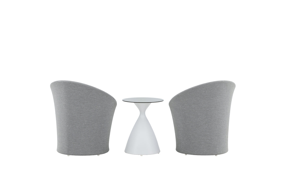 Dette nette loungesæt i hvidt og gråt kommer med to komfortable stole med tilhørende hynder og et let bord, som du nemt kan flytte. Det tidløse design gør, at det er kompatibelt i mange miljøer og passer lige så godt på den store terrasse som den lille udeplads. Et hyggeligt loungesæt, hvor du kan nyde en kop kaffe en varm morgen i solen!
