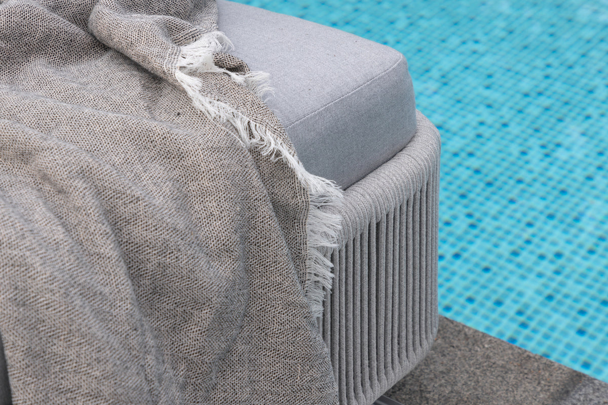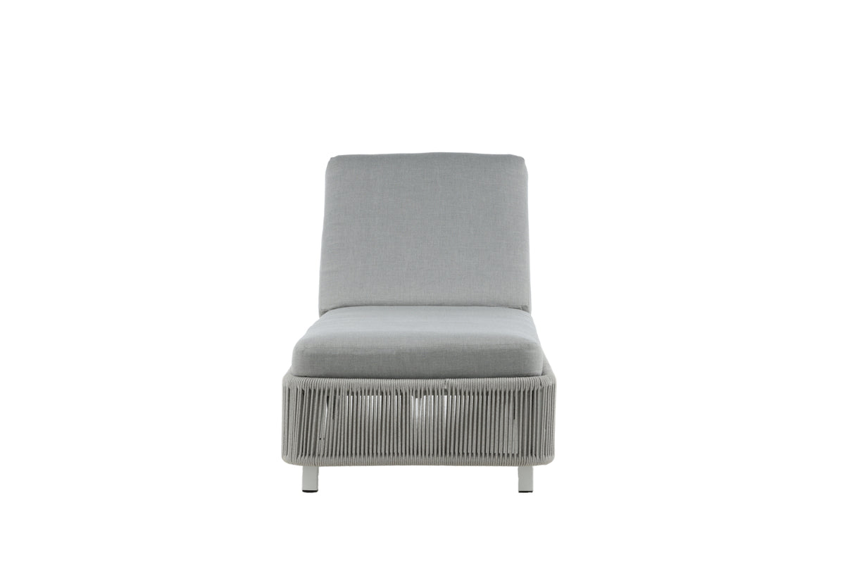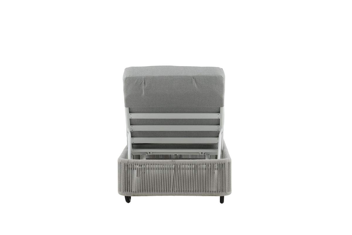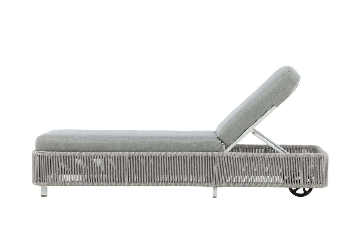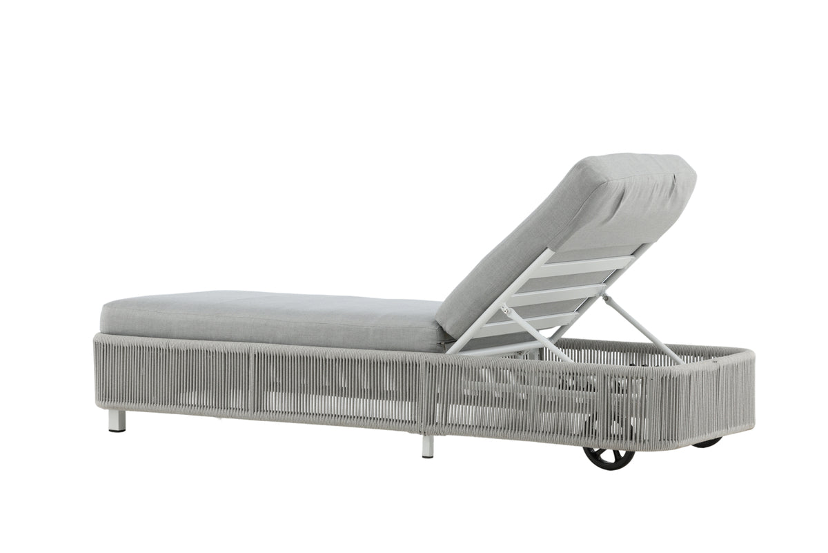 En klassisk solseng lavet af grå reb med matchende grå puder. Placer den præcist, hvor du ønsker, nemt flyttet med hjælp fra hjulet. Nyd en varm sommerdag i solen!