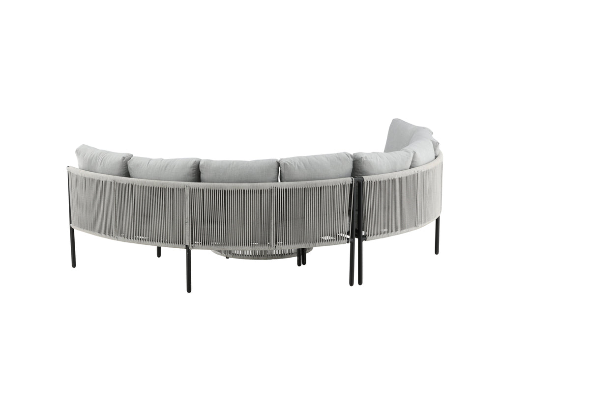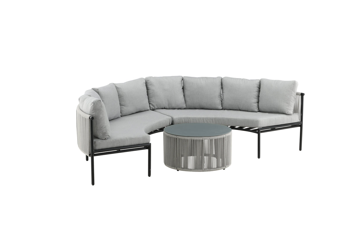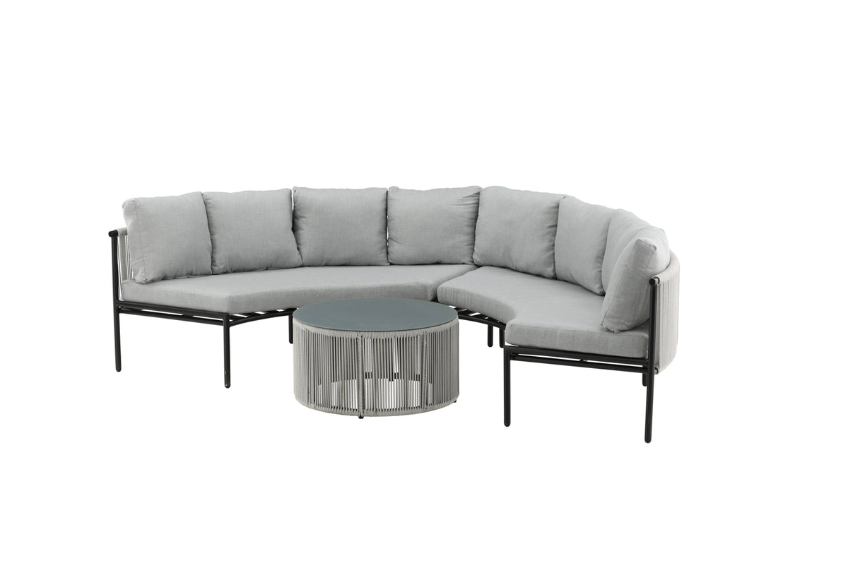 Virya sofa gruppen skaber den perfekte atmosfære på terrassen denne sommer! Sofaen har et indbydende design, formet som en halvmåne og lavet af holdbart gråt reb med en ramme af smalt sort stål. Gruppen inkluderer også et mindre kaffebord i matchende design og bløde siddehynder. Saml dine kære og nyd komfortable stunder sammen!
