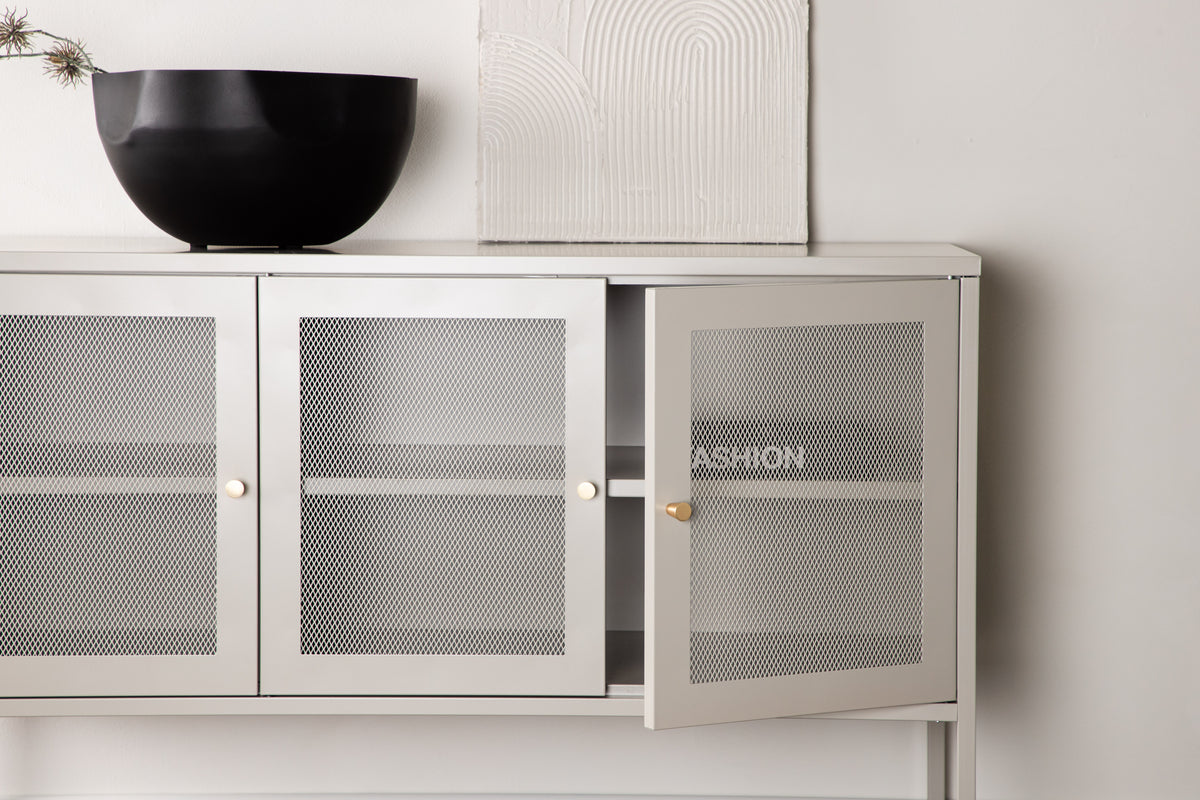 Malla - et moderne skab i et hårdt industrielt design med lækre mesh-døre og ben lavet af beige pulverlakeret stål med 2 smarte hylder til relief. Skabet er hævet af smalle, høje ben, der skaber en luftig fornemmelse og også letter støvsugningen. Det perfekte opbevaringsmøbel til alt, hvad du ønsker – fyld det med porcelæn, bøger eller smukke dekorationer. Den fleksible størrelse og elegante ydre af skabet gør det nemt at placere og passer godt ind i de fleste rum i hjemmet, så indret efter dine egne behov og ønsker!