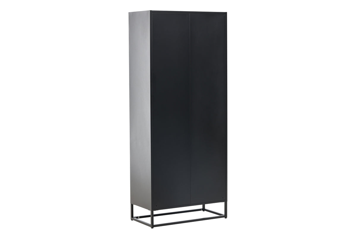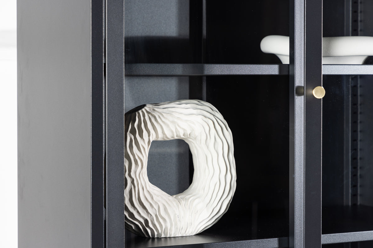 Piring er et højt skab lavet af sort stål, der tilbyder en afbalanceret blanding af åben og lukket opbevaring. De øverste glasdøre giver det en let og luftig følelse, mens de nederste døre holder mindre dekorative genstande pænt skjult. Den sorte finish giver skabet en dristig, men elegant tilstedeværelse, hvilket gør det velegnet til en række rum. Et praktisk og stilfuldt møbel til køkkenet, stuen eller kontoret.