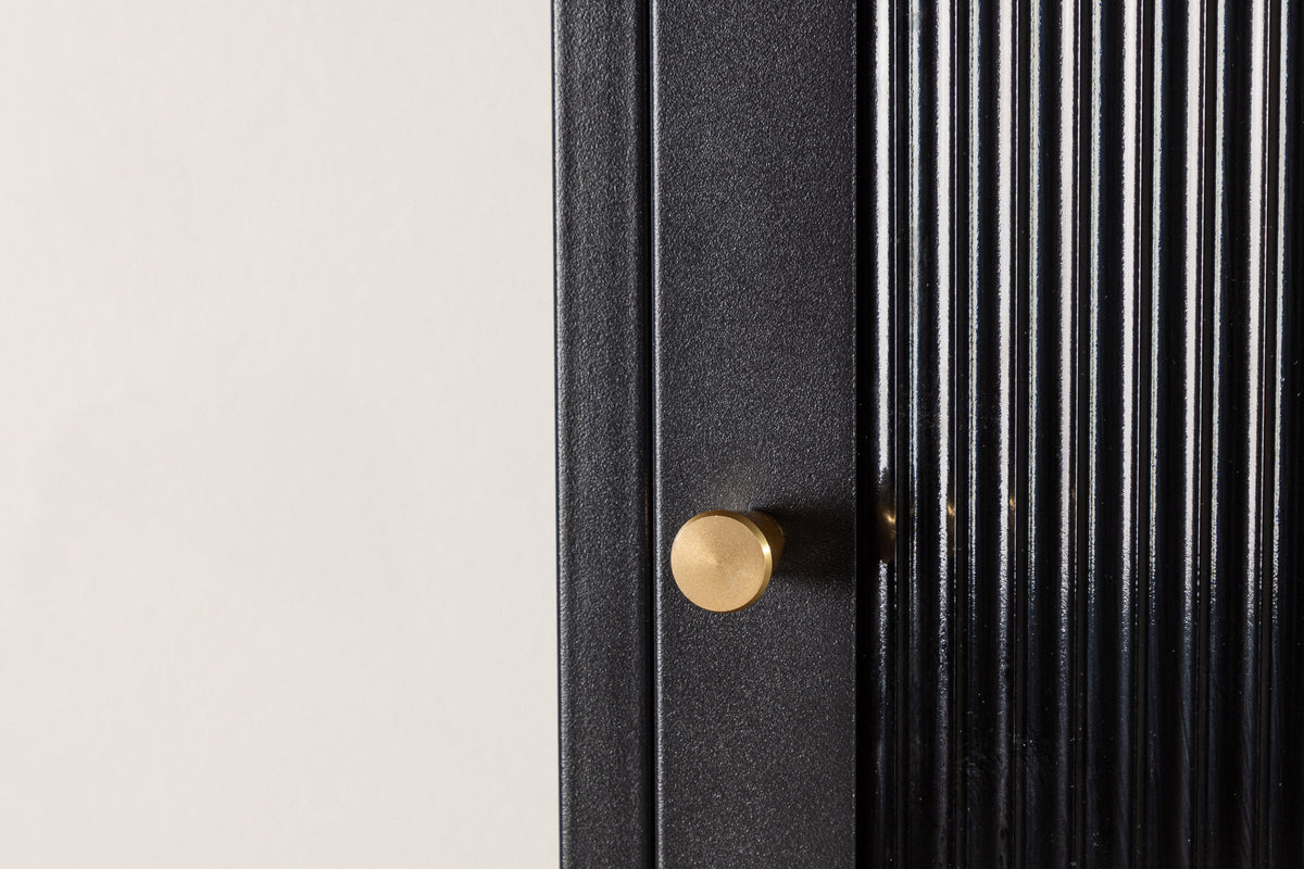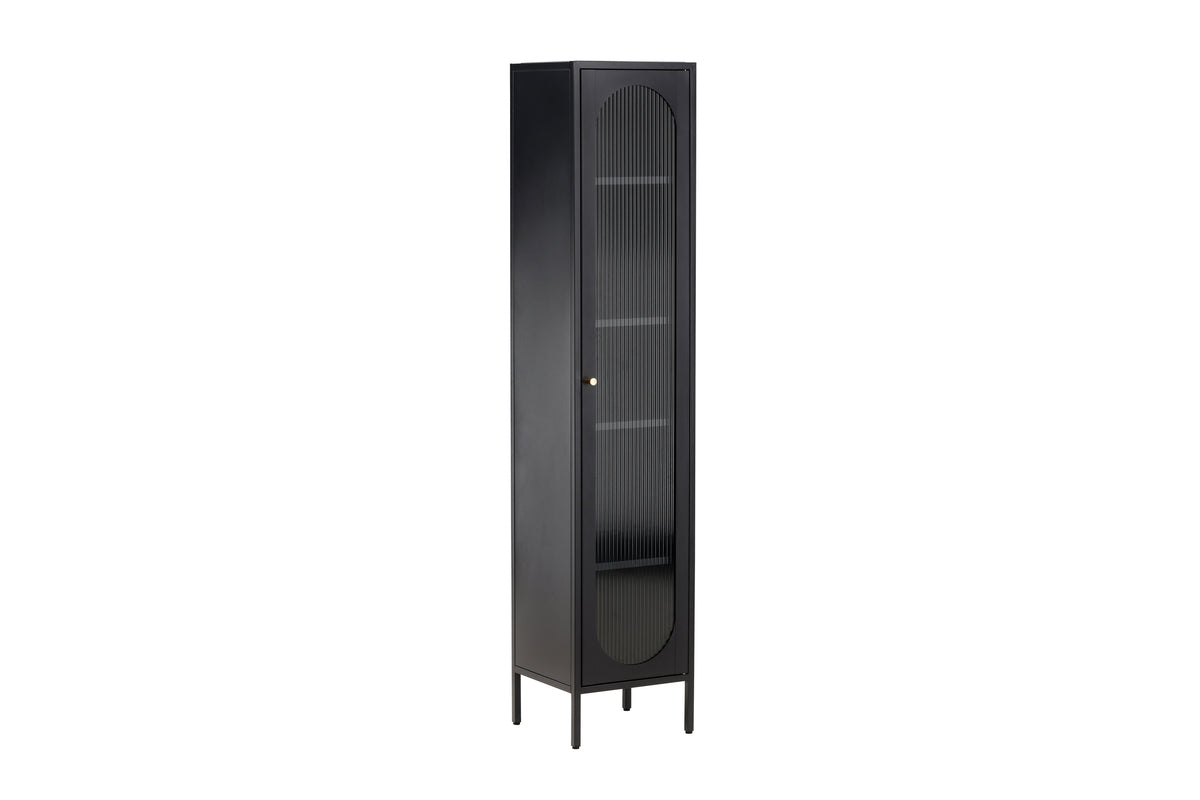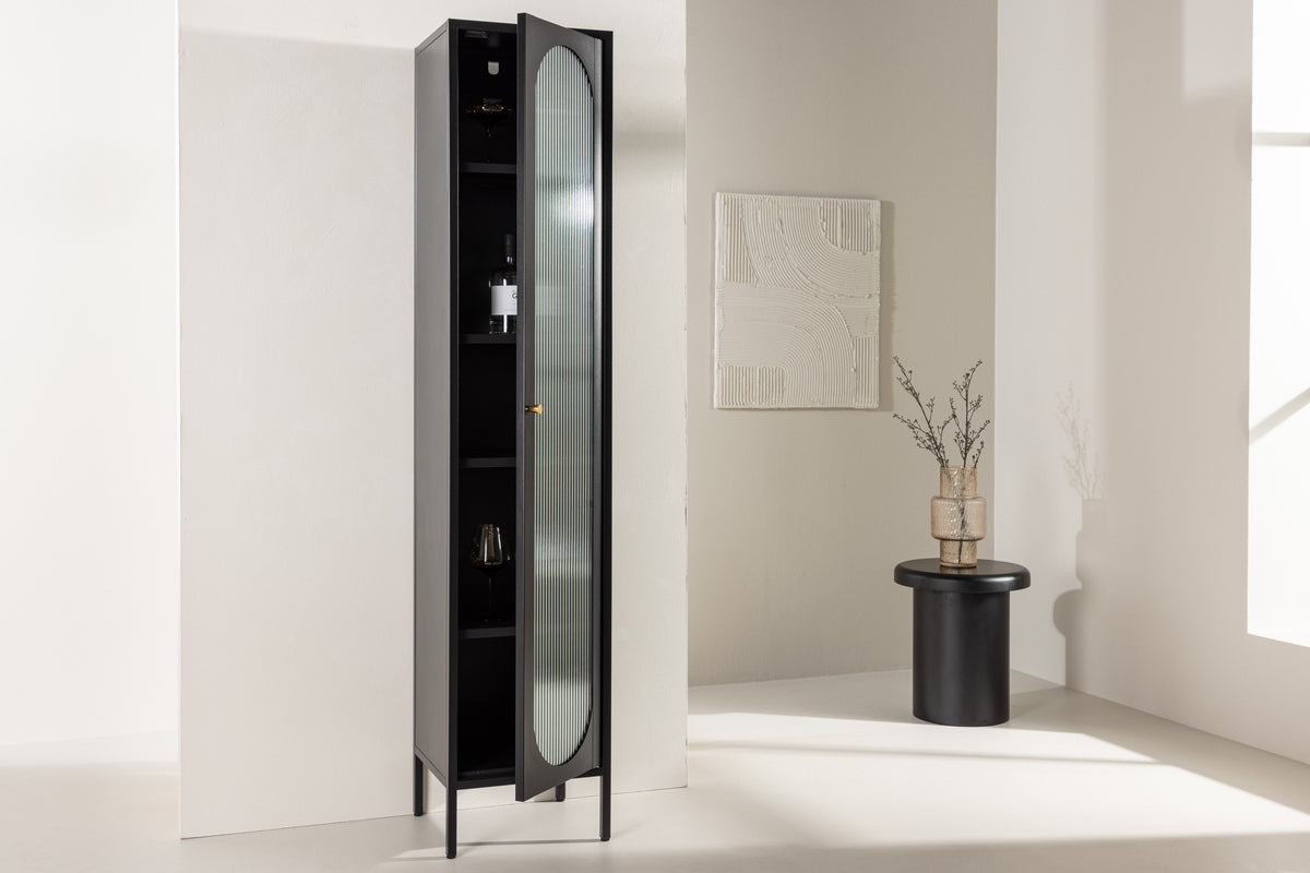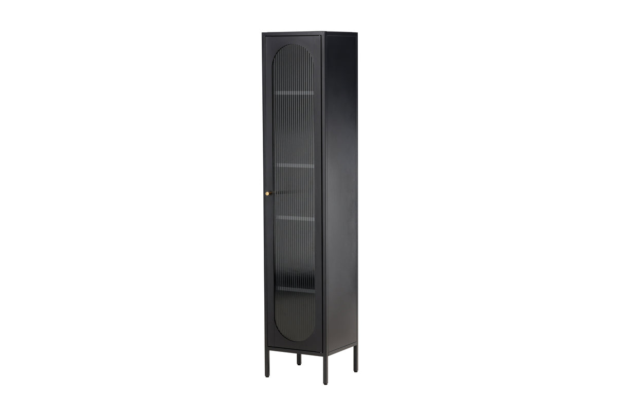 Med Cali stålskabet får du en smagfuld og praktisk opbevaringsløsning, der kombinerer stil og funktionalitet. Cali-skabet, lavet af stål, er et udtryksfuldt og pålideligt møbel, der passer perfekt ind i både moderne og traditionelle interiører. Den elegante sorte farve giver skabet en tidløs karakter, der vil komplementere din indretning med elegance. Skabet er udstyret med fire rummelige hylder, der giver dig masser af plads til organisering. Døren til skabet er lavet af bølget glas, hvilket tilføjer et subtilt strejf af tekstur og en unik visuel dimension til møblet. Hæv din indretning med Cali stålskabet og skab en stilfuld og organiseret atmosfære i dit hjem. Uanset om du placerer det i stuen, soveværelset eller kontoret, vil Cali være et praktisk og elegant supplement til dit interiør.