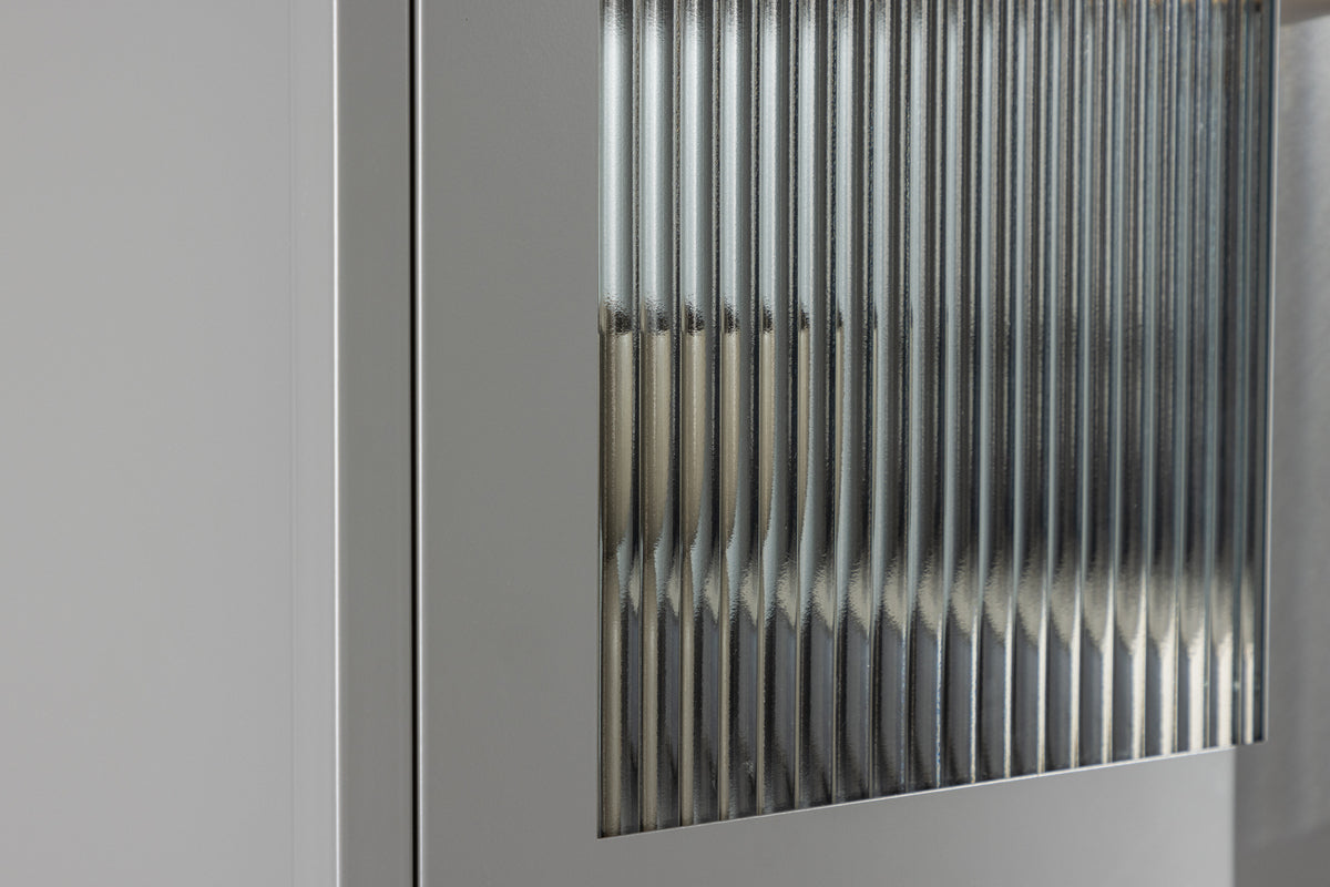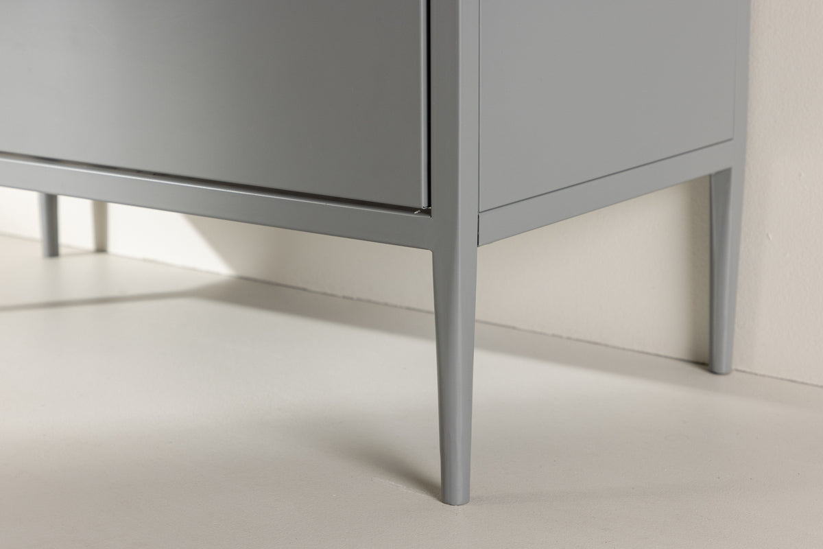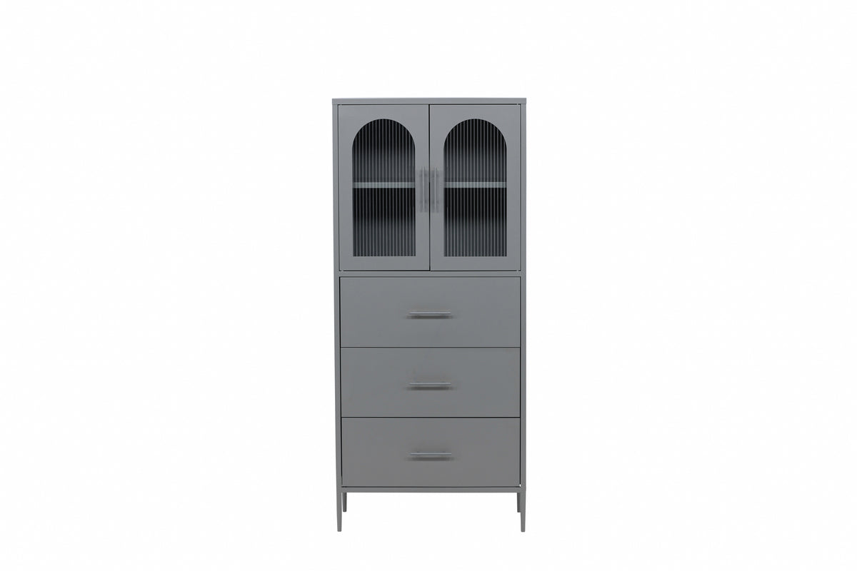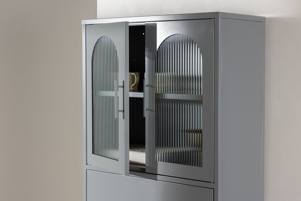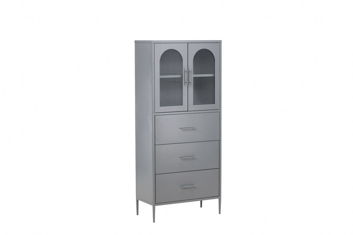Velkommen til et stort niveau af opbevaring med vores storslåede opbevaringsskab i en smuk lys grå nuance – La Paz! Dette skab er ikke bare et skab; det kombinerer stilfuld elegance og funktionalitet perfekt og vil sandsynligvis ændre din opfattelse af opbevaringsløsninger. Dette lys grå skab er gennemtænkt designet ned til mindste detalje. De messingfarvede håndtag giver et luksuriøst touch til midtpunktet. Deres subtile glans fanger din opmærksomhed og giver en fortryllende aura til det hele. Skabet er lavet i pulverlakeret metal i en behagelig lys grå nuance, der sømløst blander sig ind i mange indretningsstile. Det understøttes af fire slanke ben, der ikke kun skaber et luftigere indtryk, men også gør støvsugning lettere. I bunden er der tre rummelige skuffer, som er dit hemmelige våben mod et rodet hjem. Her kan du nemt og glat skjule ting, så dit rum forbliver pænt og organiseret. Ovenpå er der to skabsdøre indrammet af et buet design i tekstureret glas, der diskret afslører et glimt af din smukke opbevaring. Placer dit fine porcelæn eller luksuriøse glas ovenpå og lad dem blive en del af din indretning!