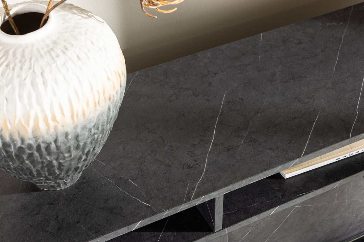 Det kan aldrig gå galt med et tidløst design - lad os præsentere TV-bænken Girona i sort farve, som på trendy vis vil løfte dit interiør til nye højder! Men med sit sofistikerede udseende og holdbare overflade af sort melamin, løfter Girona ikke kun dit interiør, men forbedrer også din oplevelse af at organisere dit rum. Girona TV-bænken kombinerer funktion og stil på en måde, der får dig til at føle dig som en designekspert. De to skydedøre, elegant designet, skjuler en rummelig hylde, der nemt imødekommer dine opbevaringsbehov. Hvad med at have alle dine enheder, kabler og fjernbetjeninger gemt bag dette elegante skab? Der er også åbne hyldekompartments, der giver dig mulighed for at vise dine yndlingsgenstande og give dit rum et strejf af personlighed. Den øverste overflade er også perfekt til at sætte stemningen i dit rum. Placer elegante lysestager og højttalere ovenpå og nyd den ultimative TV-oplevelse i en atmosfære, du selv har skabt. Velkommen til et nyt niveau af indretning med Girona!