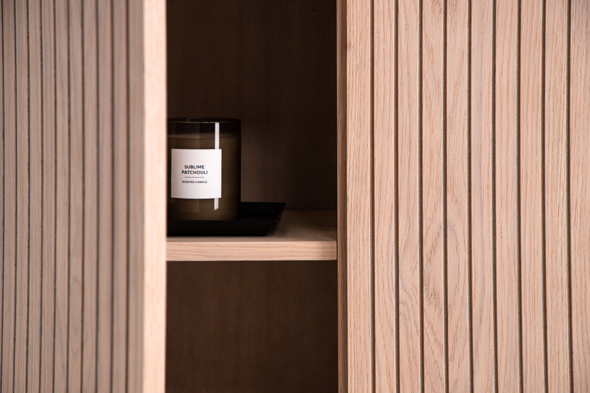 En lige så stilfuld som smart opbevaringsløsning til dit hjem! Dette høje reliefskab fra Björkön-serien fås i forskellige farver og størrelser og klatrer hurtigt op ad trendlisterne med sit stilfulde design. Skabet har to rum i ribbet look og tre hylder til skjult opbevaring. Lavet i hvidt pudset finer og hævet af smalle ben i sort stål. Placer det som et sidebord med smukke dekorationer og lysestager eller som et skjult udstillingsskab - kun fantasien sætter grænser!