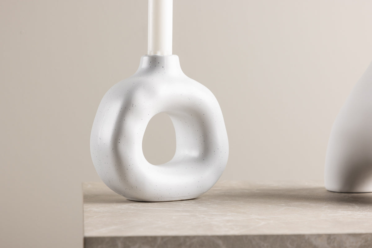 Judi lysestage er et unikt og iøjnefaldende interiørdetalje, der vil tilføre elegance til dit hjem. I en smuk hvid farve, prydet med stilfulde sorte prikker, bliver Judi en kunstnerisk kreation, der garanteret vil tiltrække opmærksomhed. Med en højde på 13 cm og en rund form er Judi lysestagen ikke kun en praktisk lysholder, men også et dekorativt kunstnerisk detalje. Lavet af stentøj kombinerer Judi både æstetik og holdbarhed. Det unikke design og den kontrasterende farvepalet gør det til et iøjnefaldende element i din indretning. Lad Judi lysestage skabe en atmosfære af stil og charme i dit hjem. Uanset om du placerer den på spisebordet, på hylden eller som en central del af din indretning, vil Judi være en samtalestarter og sætte tonen for en elegant atmosfære. Med sin elegante form og kunstneriske design er Judi den perfekte lysestage til at tilføre personlighed og karakter til dit rum.
