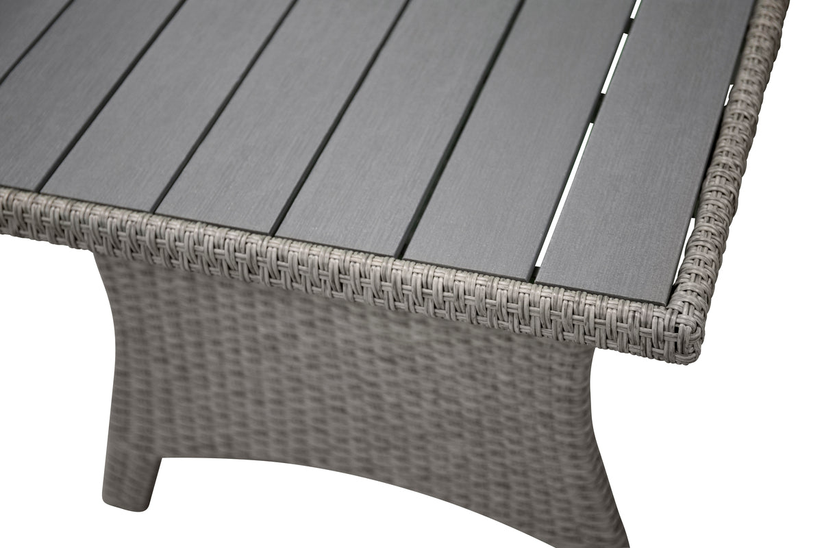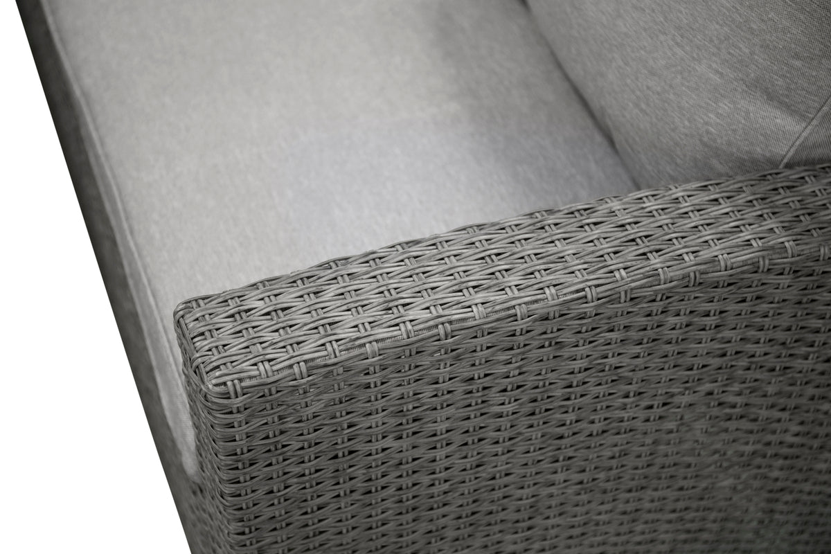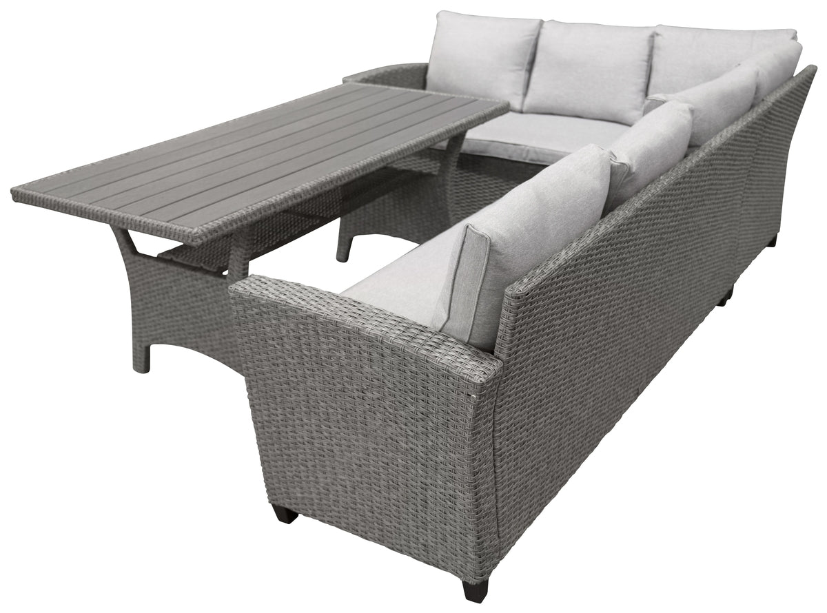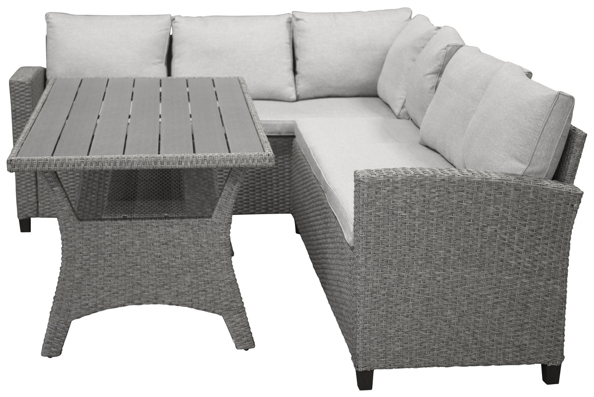 Lad tiden her blive sommerens højdepunkt! Brentwood er en trendy sofagruppe med en hjørnesofa og et højere bord i matchende, stilrent design. Sofaen er fremstillet i grå polyrattan og bordet i grå polyrattan med en bordplade i grå aintwood. Møblerne er velegnede til udendørs brug og passer derfor lige så godt i udestuen som på terrassen. Lysegrå hynder er inkluderet. Lettere montering kræves. Nyd sene sommeraftener sammen med nære og kære!