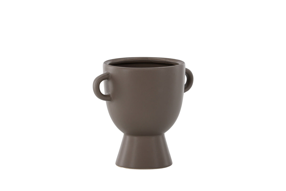 Opdag skønheden og funktionaliteten i Cent-serien, hvor hver potte og vase er en unik kunstnerisk skabelse. Vælg din favorit blandt de forskellige størrelser og former. Cent potten, lavet i robust stentøj og klædt i en varm brun nuance, er et elegant supplement til dit hjem. Med en højde på 18 cm og en rund form bliver Cent potten et perfekt hjem for dine planter eller blomster. Dens velafbalancerede design inkluderer et håndtag på hver side, hvilket tilføjer et ekstra detalje til potten. For at tilføje ekstra højde og elegance har Cent en base, der giver en løftende effekt og fremhæver dens unikke design. Denne potte er ikke kun en praktisk beholder, men også et kunstnerisk element, der vil tilføje et strejf af karakter til dit hjem. Elegance møder funktionalitet med Cent potten – en del af en serie, der kombinerer tidløst design med moderne æstetik. Udforsk serien og lad Cent blive en central del af din indretning.